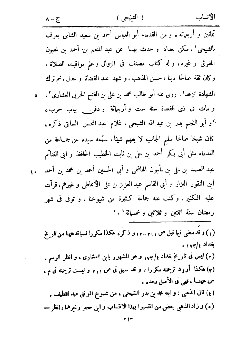 ثمانين وأربعمائة ومن القدماء أبو العباس أحمد بن سعيد الشامي يعرف بالشيحى [1] ، سكن بغداد وحدث بها عن عبد المنعم بن أحمد بن غلبون المقرئ وغيره، وله كتاب مصنف في الزوال وعلم مواقيت الصلاة، وكان ثقة صالحا دينا، حسن المذهب، وشهد عند القضاة وعدل، ثم ترك الشهادة تزهدا، روى عنه أبو طالب محمد بن على بن الفتح الحربي العشاري [2] ، ومات في ذي القعدة سنة ست وأربعمائة ودفن بباب حرب [3] وأبو النجم بدر بن عبد الله الشيحى، غلام عبد المحسن السابق ذكره، كان شيخا صالحا سليم الجانب لا يفهم شيئا، سمّعه سيده عن جماعة من القدماء مثل أبى بكر أحمد بن على بن ثابت الخطيب الحافظ وأبى الغنائم عبد الصمد بن على بن مأمون الهاشمي وأبى الحسين أحمد بن محمد بن أحمد ابن النقور البزاز وأبى القاسم عبد العزيز بن على الأنماطي وغيرهم، قرأت عليه الكثير، وكتب عنه جماعة كثيرة من شيوخنا، وتوفى في شهر رمضان سنة اثنتين وثلاثين وخمسمائة [4] . [5]