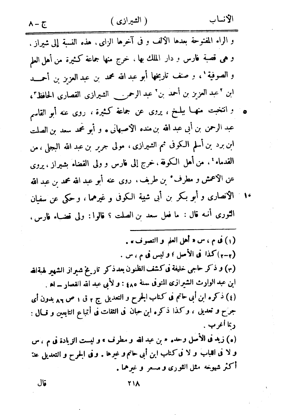 والراء المفتوحة بعدها الألف وفي آخرها الزاى، هذه النسبة إلى شيراز، وهي قصبة فارس ودار الملك بها، خرج منها جماعة كثيرة من أهل العلم والصوفية [1] ، وصنف تاريخها أبو عبد الله محمد بن عبد العزيز بن أحمد ابن [2] عبد العزيز بن أحمد بن [2] عبد الرحمن الشيرازي القصارى الحافظ [3] ، وانتخبت منها ببلخ، يروى عن جماعة كثيرة، روى عنه أبو القاسم عبد الرحمن بن أبى عبد الله بن مندة الأصبهاني وأبو محمد سعد بن الصلت ابن برد بن أسلم الكوفي ثم الشيرازي، مولى جرير بن عبد الله البجلي، من القدماء [4] ، من أهل الكوفة، خرج إلى فارس وولى القضاء بشيراز، يروى عن الأعمش ومطرف [5] بن طريف، روى عنه أبو عبد الله محمد بن عبد الله الأنصاري وأبو بكر بن أبى شيبة الكوفي وغيرهما، وحكى عن سفيان الثوري أنه قال: ما فعل سعد بن الصلت؟ قالوا: ولى قضاء فارس،