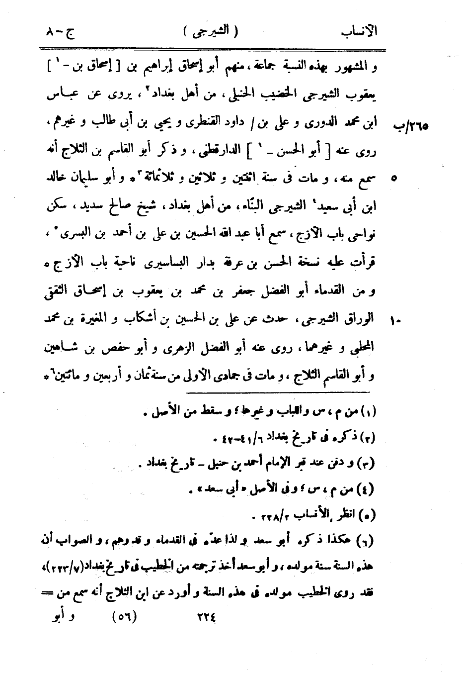 والمشهور بهذه النسبة جماعة، منهم أبو إسحاق إبراهيم بن [إسحاق بن-[1]] يعقوب الشيرجي الخضيب الحنبلي، من أهل بغداد [2] ، يروى عن عباس 265/ ب ابن محمد الدوري وعلى بن/ داود القنطري ويحيى بن أبى طالب وغيرهم، روى عنه [أبو الحسن-[1]] الدار قطنى، وذكر أبو القاسم بن الثلاج أنه سمع منه، ومات في سنة اثنتين وثلاثين وثلاثمائة [3] وأبو سليمان خالد ابن أبى سعيد [4] الشيرجي البنّاء، من أهل بغداد، شيخ صالح سديد، سكن نواحي باب الأزج، سمع أبا عبد الله الحسين بن على بن أحمد بن البسري [5] ، قرأت عليه نسخة الحسن بن عرفة بدار البساسيري ناحية باب الأزج ومن القدماء أبو الفضل جعفر بن محمد بن يعقوب بن إسحاق الثقفي الوراق الشيرجي، حدث عن على بن الحسين بن إشكاب والمغيرة بن محمد المحلبى وغيرهما، روى عنه أبو الفضل الزهري وأبو حفص بن شاهين وأبو القاسم الثلاج، ومات في جمادى الأولى من سنة ثمان وأربعين ومائتين [6]