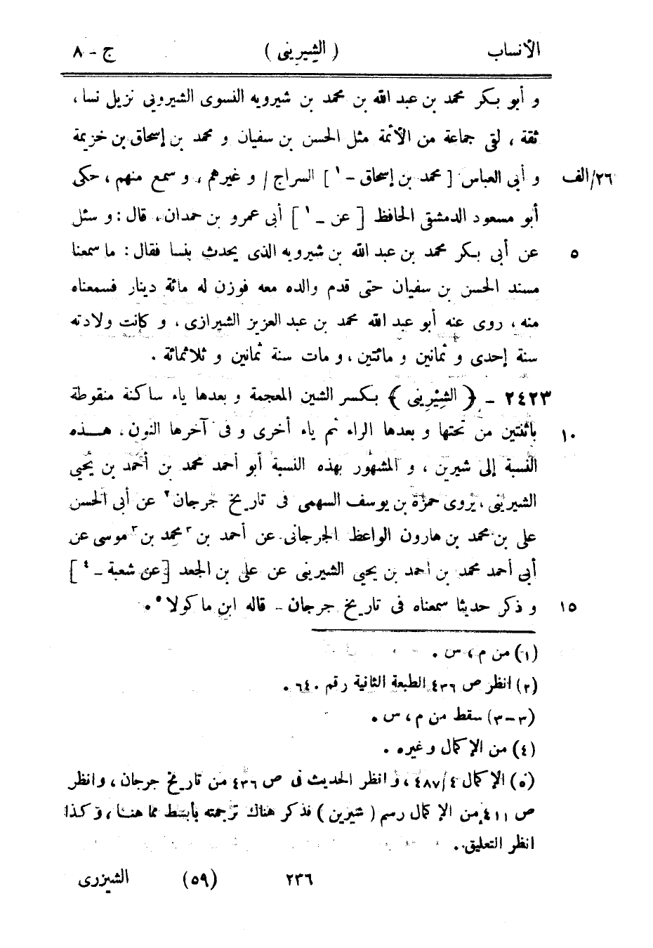 [5] الإكمال 4/ 487، وانظر الحديث في ص 436 من تاريخ جرجان، وانظر ص 411 من الإكمال رسم (شيرين) فذكر هناك ترجمته بأبسط مما هنا، وكذا انظر التعليق.