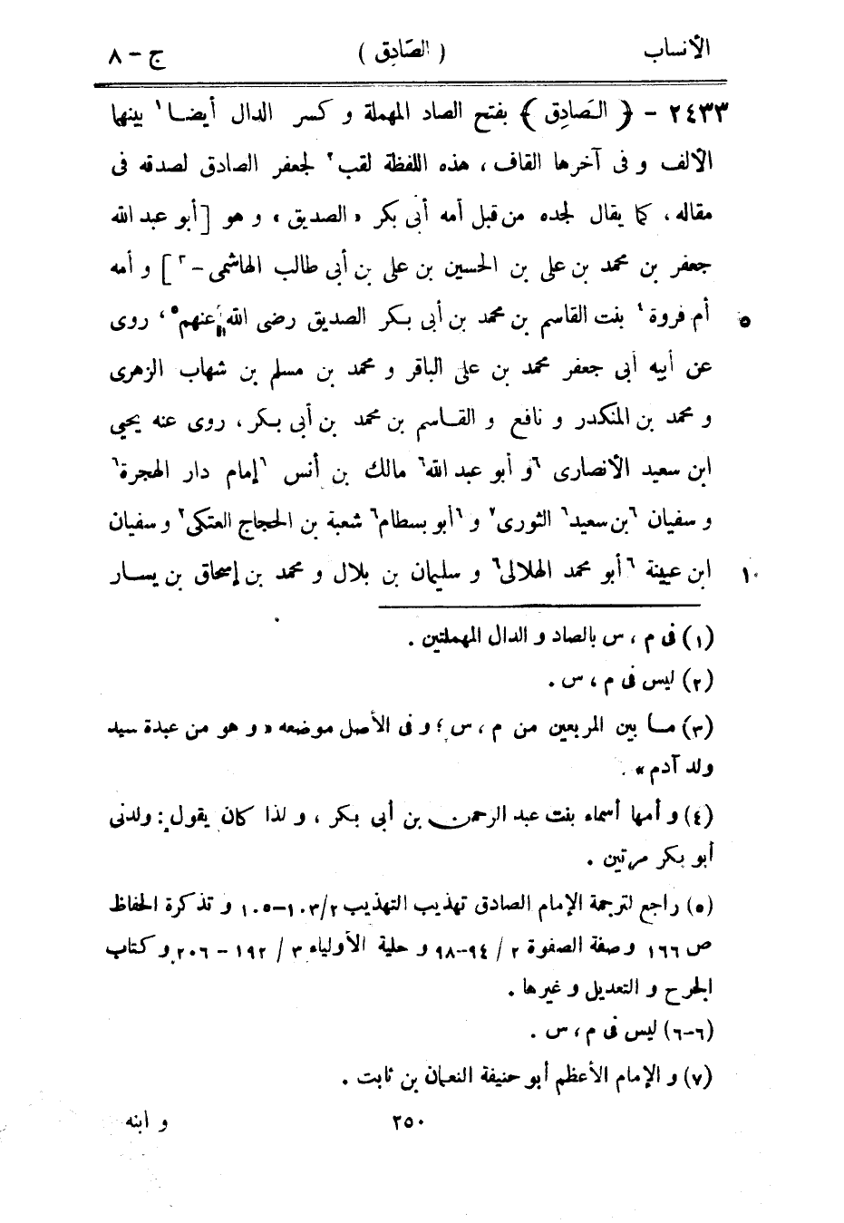 بفتح الصاد المهملة وكسر الدال أيضا [1] بينهما الألف وفي آخرها القاف، هذه اللفظة لقب [2] لجعفر الصادق لصدقه في مقاله، كما يقال لجده من قبل أمه أبى بكر «الصديق» وهو [أبو عبد الله جعفر بن محمد بن على بن الحسين بن على بن أبى طالب الهاشمي-[3]] وأمه أم فروة [4] بنت القاسم بن محمد بن أبى بكر الصديق رضى الله عنهم [5] ، روى عن أبيه أبى جعفر محمد بن على الباقر ومحمد بن مسلم بن شهاب الزهري ومحمد بن المنكدر ونافع والقاسم بن محمد بن أبى بكر، روى عنه يحيى ابن سعيد الأنصاري [6] وأبو عبد الله [6] مالك بن أنس [6] إمام دار الهجرة [6] وسفيان [6] بن سعيد [6] الثوري [7] و [6] أبو بسطام [6] شعبة بن الحجاج العتكيّ [2] وسفيان ابن عيينة [6] أبو محمد الهلالي [6] وسليمان بن بلال ومحمد بن إسحاق بن يسار