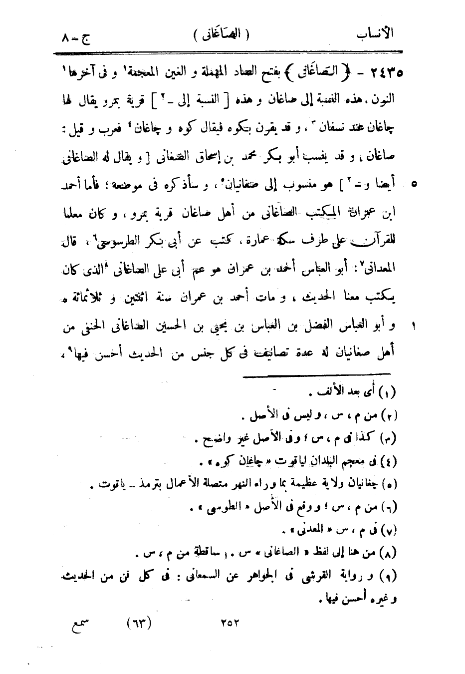 صاغان، وقد ينسب أبو بكر محمد بن إسحاق الصغاني [ويقال له الصاغاني أيضا و [2]] هو منسوب إلى صغانيان [5] ، وسأذكره في موضعه، فأما أحمد ابن عمران المكتب الصاغاني من أهل صاغان قرية بمرو، وكان معلما للقرآن على طرف سكة عمارة، كتب عن أبى بكر الطرسوسي [6] ، قال المعداني [7] : أبو العباس أحمد بن عمران هو عم أبى على الصاغاني [8] الّذي كان يكتب معنا الحديث، ومات أحمد بن عمران سنة اثنتين وثلاثمائة وأبو العباس الفضل بن العباس بن يحيى بن الحسين الصاغاني الحنفي من أهل صغانيان له عدة تصانيف في كل جنس من الحديث أحسن فيها [9] ،
