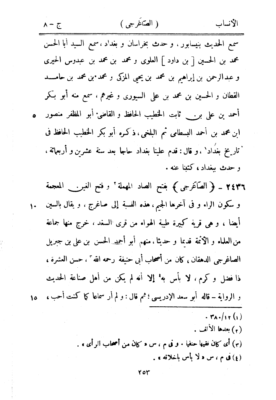 بفتح الصاد المهملة [2] وفتح الغين المعجمة وسكون الراء وفي آخرها الجيم، هذه النسبة إلى صاغرج، ويقال بالسين أيضا، وهي قرية كبيرة طيبة الهواء من قرى السغد، خرج منها جماعة من العلماء والأئمة قديما وحديثا، منهم أبو أحمد الحسن بن على بن جبريل الصاغرجى الدهقان، كان من أصحاب أبى حنيفة رحمه الله [3] ، حسن العشرة، ذا فضل وكرم، لا بأس به [4] إلا أنه لم يكن من أهل صناعة الحديث والرواية- قاله أبو سعد الإدريسي، ثم قال: ولم أر سماعا كما كنت أحب،