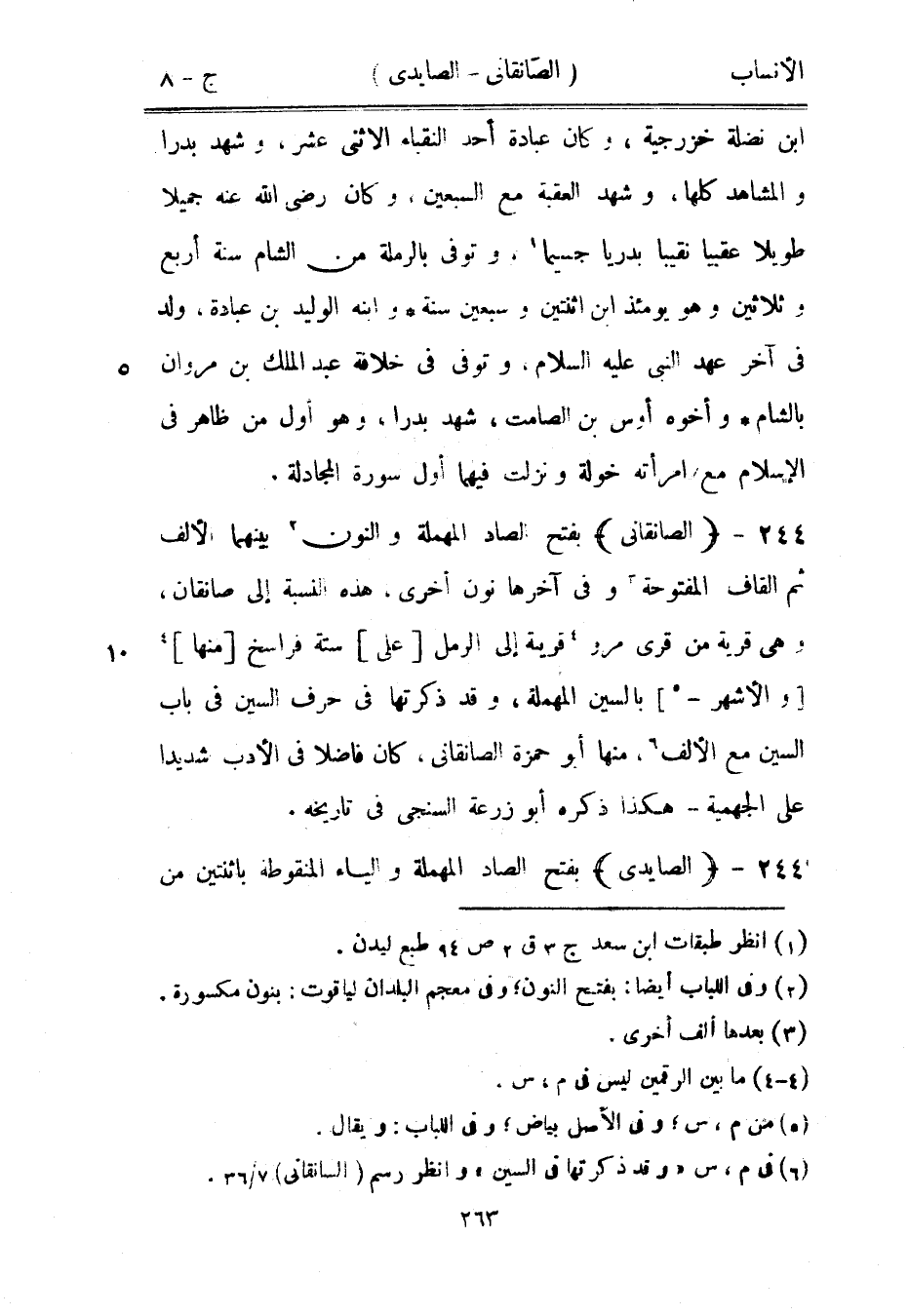 بفتح الصاد المهملة والنون [2] بينهما الألف ثم القاف المفتوحة [3] وفي آخرها نون أخرى، هذه النسبة إلى صانقان، وهي قرية من قرى مرو [4] قريبة إلى الرمل [على] ستة فراسخ [منها] [4] [والأشهر-[5]] بالسين المهملة، وقد ذكرتها في حرف السين في باب السين مع الألف [6] ، منها أبو حمزة الصانقانى، كان فاضلا في الأدب شديدا على الجهمية- هكذا ذكره أبو زرعة السنجى في تاريخه.