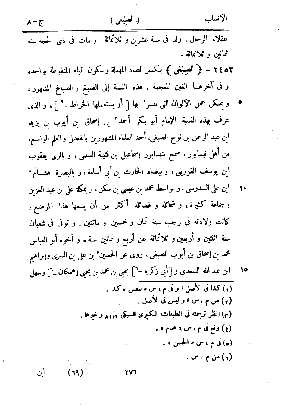بكسر الصاد المهملة وسكون الباء المنقوطة بواحدة وفي آخرها الغين المعجمة، هذه النسبة إلى الصبغ والصباغ المشهور، ويمكن عمل الألوان التي يبسر [1] [؟] بها [أو يستعملها الخراط-[2]] ، والّذي عرف بهذه النسبة الإمام أبو بكر أحمد [3] بن إسحاق بن أيوب بن يزيد ابن عبد الرحمن بن نوح الصبغى، أحد العلماء المشهورين بالفضل والعلم الواسع، من أهل نيسابور، سمع بنيسابور إسماعيل بن قتيبة السلمي، وبالري يعقوب ابن يوسف القزويني، وببغداد الحارث بن أبى أسامة، وبالبصرة هشام [4] ابن على السدوسي، وبواسط محمد بن عيسى بن سكن، وبمكة على بن عبد العزيز وجماعة كثيرة، وشمائله وفضائله أكثر من أن يسعها هذا الموضع، كانت ولادته في رجب سنة ثمان وخمسين ومائتين، وتوفى في شعبان سنة اثنتين وأربعين وثلاثمائة عن أربع وثمانين سنة وأخوه أبو العباس محمد بن إسحاق بن أيوب الصبغى، روى عن الحسين [5] بن على بن السري وإبراهيم ابن عبد الله السعدي و [أبى زكريا-[6]] يحيى بن محمد بن يحيى [همكان-[6]] وسهل
