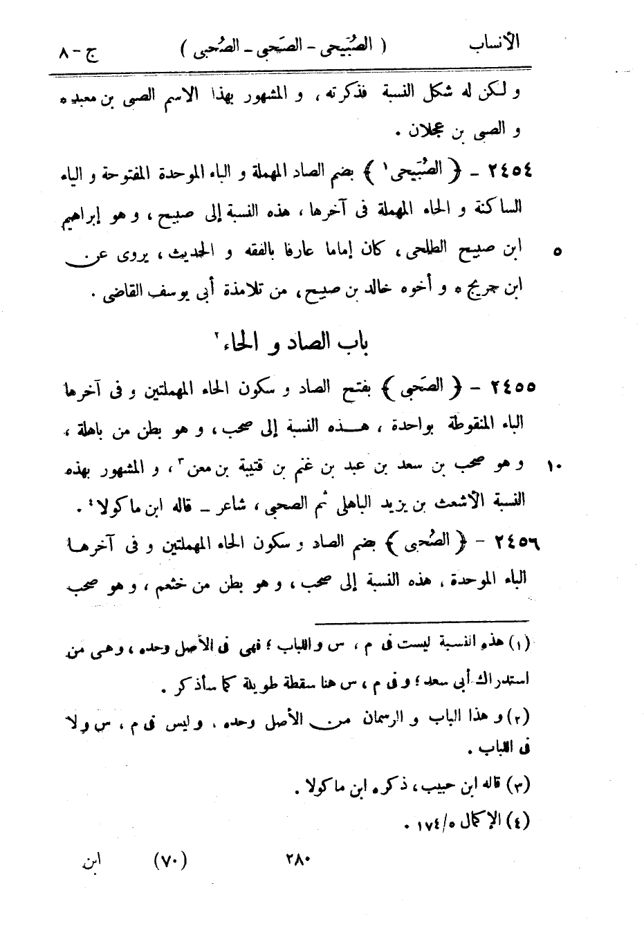 بفتح الصاد وسكون الحاء المهملتين وفي آخرها الباء المنقوطة بواحدة، هذه النسبة إلى صحب، وهو بطن من باهلة، وهو صحب بن سعد بن عبد بن غنم بن قتيبة بن معن [3] ، والمشهور بهذه النسبة الأشعث بن يزيد الباهلي ثم الصحبى، شاعر- قاله ابن ماكولا [4] .