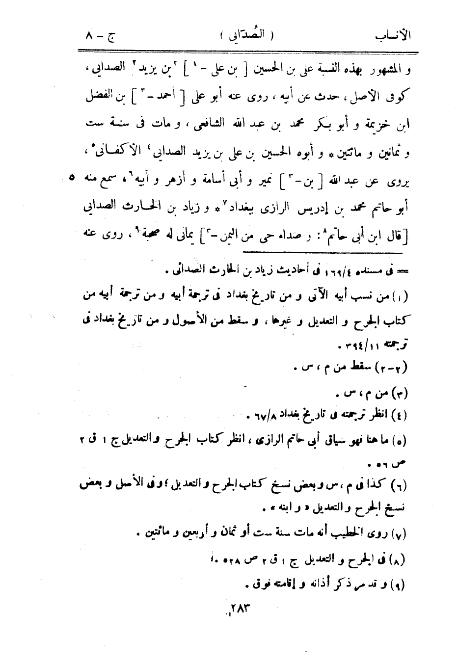 والمشهور بهذه النسبة على بن الحسين [بن على-[1]] [2] بن يزيد [2] الصدائي، كوفى الأصل، حدث عن أبيه، روى عنه أبو على [أحمد-[3]] بن الفضل ابن خزيمة وأبو بكر محمد بن عبد الله الشافعيّ، ومات في سنة ست وثمانين ومائتين وأبوه الحسين بن على بن يزيد الصدائي [4] الأكفاني [5] ، يروى عن عبد الله [بن-[3]] نمير وأبى أسامة وأزهر وأبيه [6] ، سمع منه أبو حاتم محمد بن إدريس الرازيّ ببغداد [7] وزياد بن الحارث الصدائي [قال ابن أبى حاتم [8] : وصداء حي من اليمن-[3]] يماني له صحبة [9] ، روى عنه