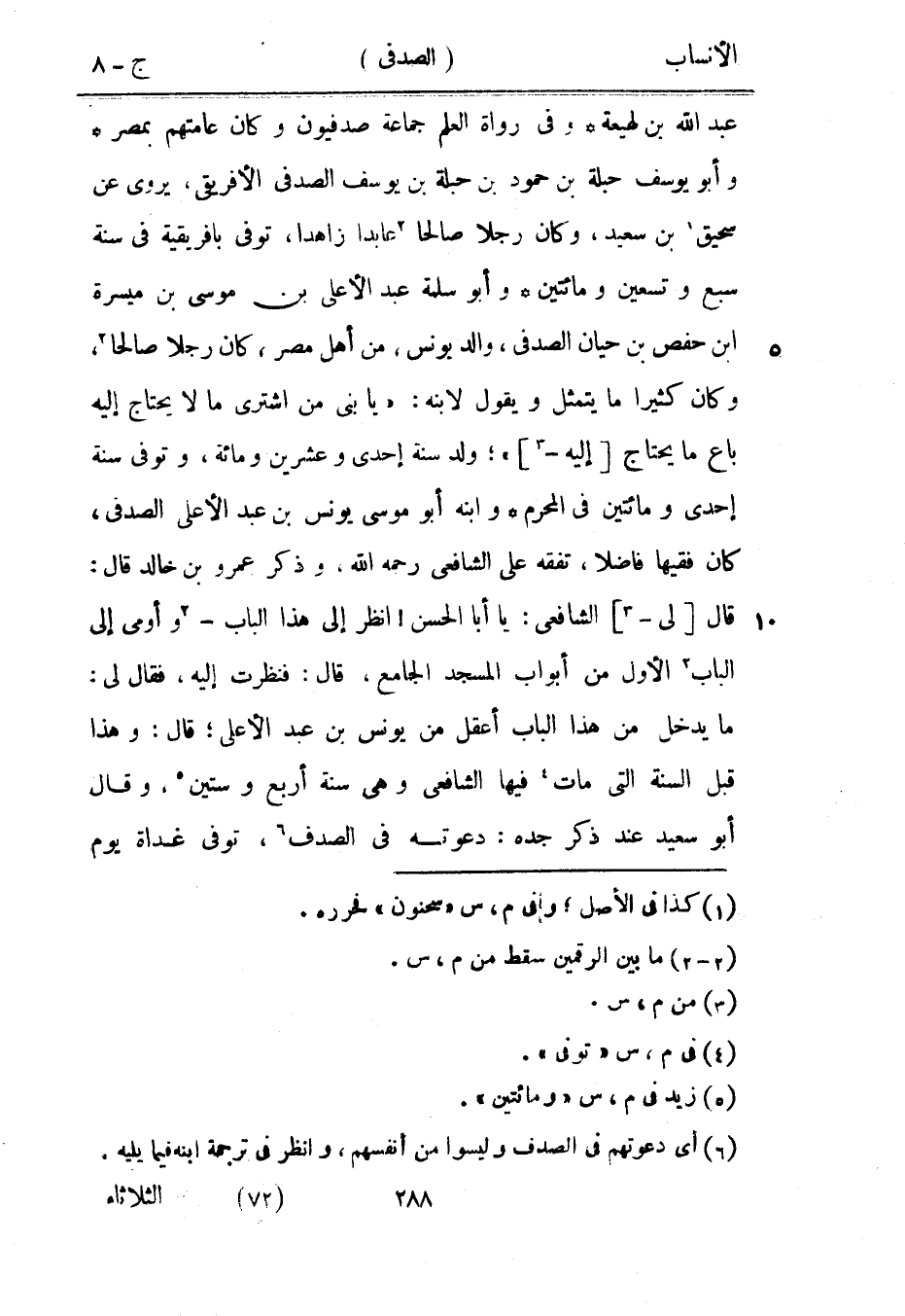 عبد الله بن لهيعة وفي رواة العلم جماعة صدفيون وكان عامتهم بمصر وأبو يوسف حبلة بن حمود بن حبلة بن يوسف الصدفي الإفريقي، يروى عن سحيق [1] بن سعيد، وكان رجلا صالحا [2] عابدا زاهدا، توفى بإفريقية في سنة سبع وتسعين ومائتين وأبو سلمة عبد الأعلى بن موسى بن ميسرة ابن حفص بن حيان الصدفي، والد يونس، من أهل مصر، كان رجلا صالحا [2] ، وكان كثيرا ما يتمثل ويقول لابنه: «يا بنى من اشترى ما لا يحتاج إليه باع ما يحتاج [إليه-[3]] » ، ولد سنة إحدى وعشرين ومائة، وتوفى سنة إحدى ومائتين في المحرم وابنه أبو موسى يونس بن عبد الأعلى الصدفي، كان فقيها فاضلا، تفقه على الشافعيّ رحمه الله، وذكر عمرو بن خالد قال: