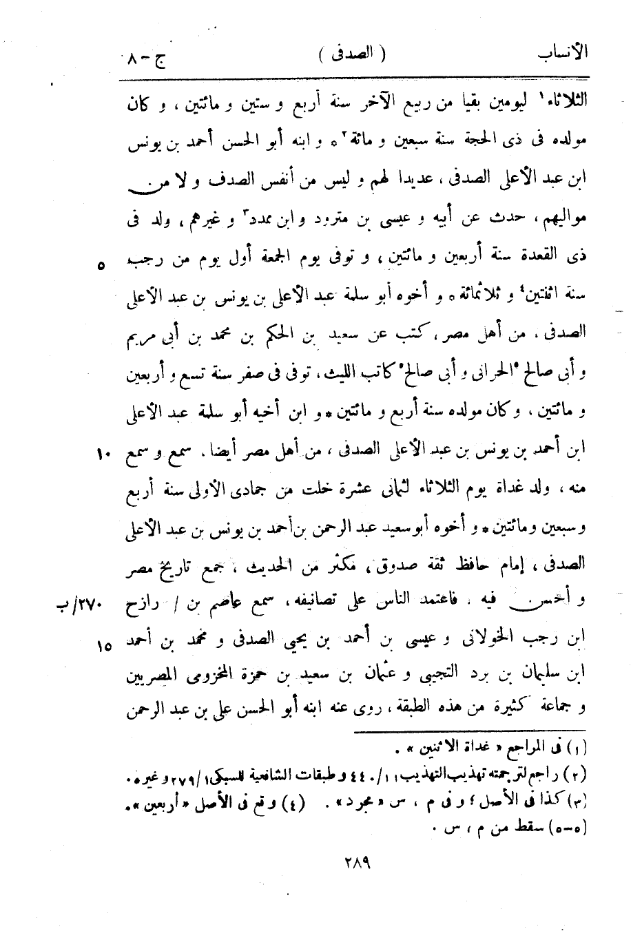 الثلاثاء [1] ليومين بقيا من ربيع الآخر سنة أربع وستين ومائتين، وكان مولده في ذي الحجة سنة سبعين ومائة [2] وابنه أبو الحسن أحمد بن يونس ابن عبد الأعلى الصدفي، عديدا لهم وليس من أنفس الصدف ولا من مواليهم، حدث عن أبيه وعيسى بن مترود وابن ممدد [3] وغيرهم، ولد في ذي القعدة سنة أربعين ومائتين، وتوفى يوم الجمعة أول يوم من رجب سنة اثنتين [4] وثلاثمائة وأخوه أبو سلمة عبد الأعلى بن يونس بن عبد الأعلى الصدفي، من أهل مصر، كتب عن سعيد بن الحكم بن محمد بن أبى مريم وأبى صالح [5] الحراني وأبى صالح [5] كاتب الليث، توفى في صفر سنة تسع وأربعين ومائتين، وكان مولده سنة أربع ومائتين وابن أخيه أبو سلمة عبد الأعلى ابن أحمد بن يونس بن عبد الأعلى الصدفي، من أهل مصر أيضا، سمع وسمع منه، ولد غداة يوم الثلاثاء لثماني عشرة خلت من جمادى الأولى سنة أربع وسبعين ومائتين وأخوه أبو سعيد عبد الرحمن بن أحمد بن يونس بن عبد الأعلى الصدفي، إمام حافظ ثقة صدوق، مكثر من الحديث، جمع تاريخ مصر وأحسن فيه. فاعتمد الناس على تصانيفه، سمع عاصم بن/ رازح 270/ ب ابن رجب الخولانيّ وعيسى بن أحمد بن يحيى الصدفي ومحمد بن أحمد ابن سليمان بن برد التجيبي وعثمان بن سعيد بن حمزة المخزومي المصريين وجماعة كثيرة من هذه الطبقة، روى عنه ابنه أبو الحسن على بن عبد الرحمن
