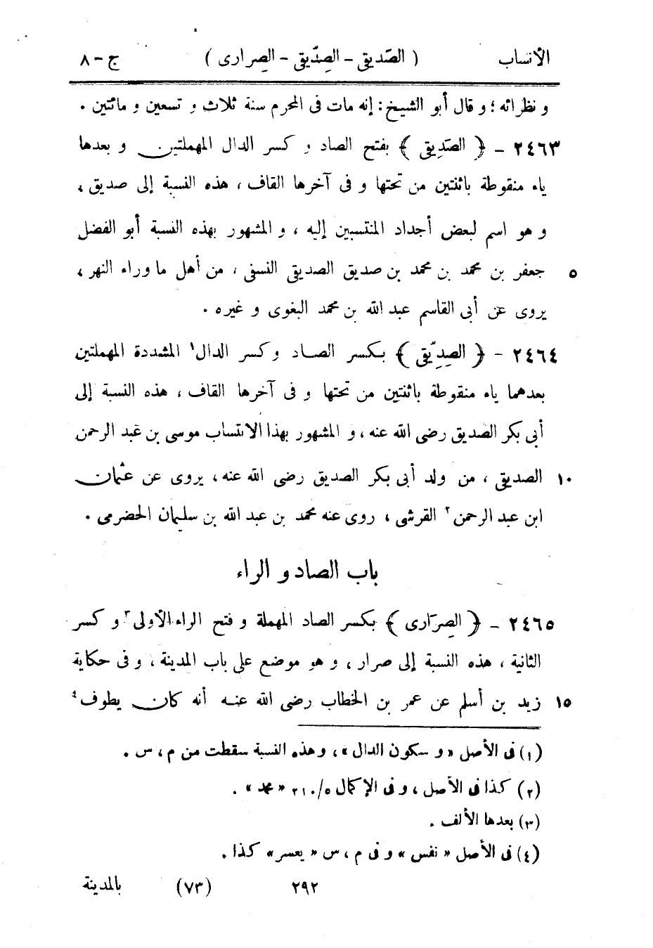 بكسر الصاد المهملة وفتح الراء الأولى [3] وكسر الثانية، هذه النسبة إلى صرار، وهو موضع على باب المدينة، وفي حكاية زيد بن أسلم عن عمر بن الخطاب رضى الله عنه أنه كان يطوف [4]