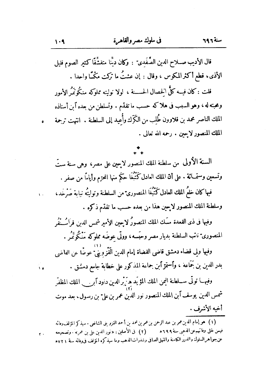 السنة الأولى من سلطنة الملك المنصور لاچين على مصر، وهى سنة ستّ وتسعين وستمائة. على أنّ الملك العادل كتبغا حكم منها المحرّم وأياما من صفر.