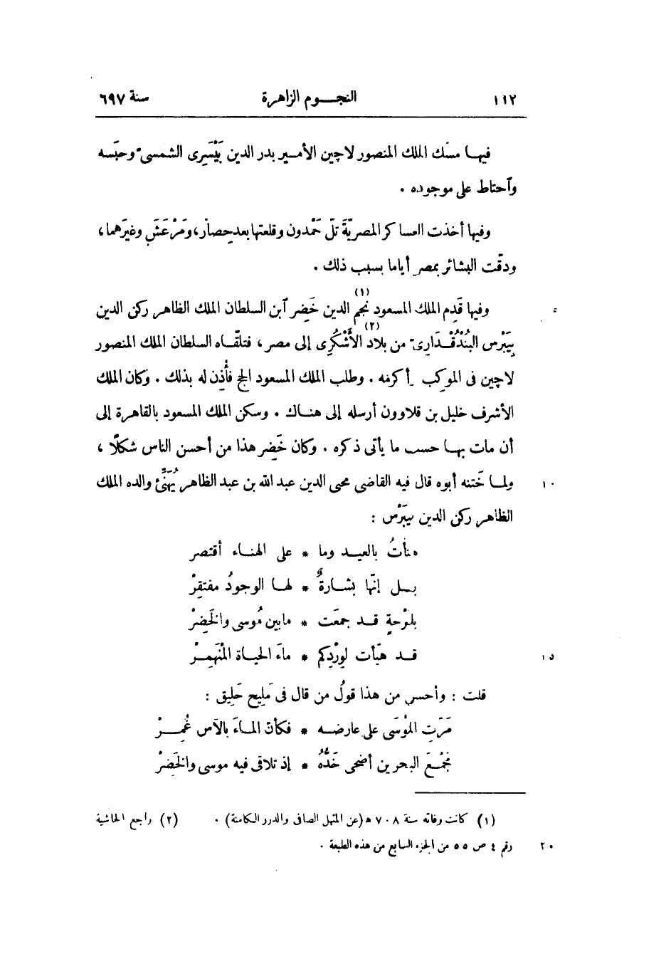 فيها مسك الملك المنصور لاچين الأمير بدر الدين بيسرى الشمسىّ وحبسه واحتاط على موجوده.