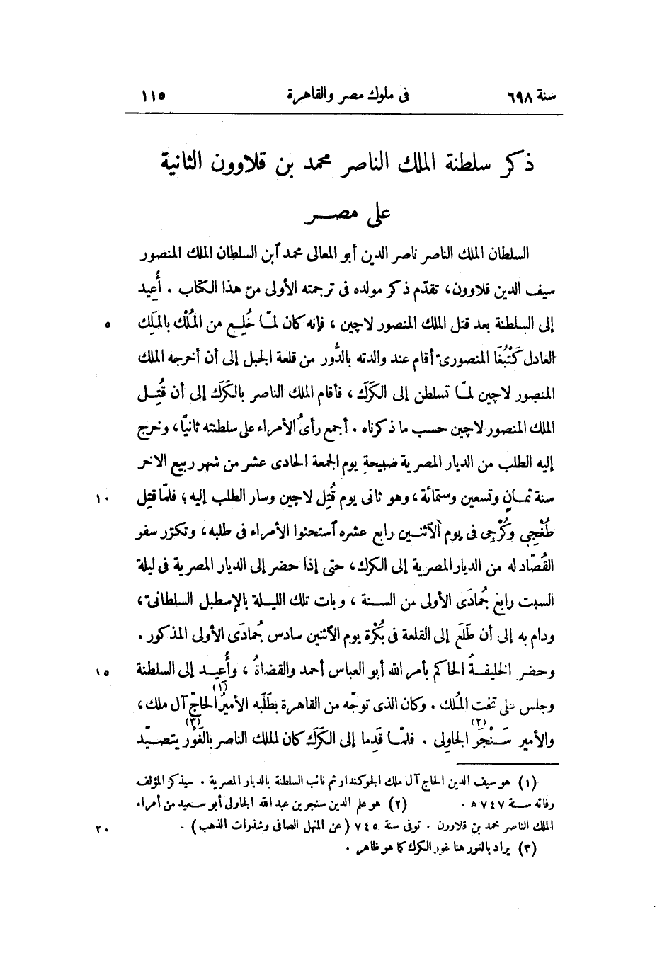 السلطان الملك الناصر ناصر الدين أبو المعالى محمد ابن السلطان الملك المنصور سيف الدين قلاوون، تقدّم ذكر مولده فى ترجمته الأولى من هذا الكتاب. أعيد إلى السلطنة بعد قتل الملك المنصور لاچين، فإنه كان لمّا خلع من الملك بالملك العادل كتبغا المنصورىّ أقام عند والدته بالدّور من قلعة الجبل إلى أن أخرجه الملك المنصور لاچين لمّا تسلطن إلى الكرك، فأقام الملك الناصر بالكرك إلى أن قتل الملك المنصور لاچين حسب ما ذكرناه. أجمع رأى الأمراء على سلطنته ثانيا، وخرج إليه الطلب من الديار المصرية صبيحة يوم الجمعة الحادى عشر من شهر ربيع الاخر سنة ثمان وتسعين وستمائة، وهو ثانى يوم قتل لاچين وسار الطلب إليه؛ فلمّا قتل طغجى وكرجى فى يوم الاثنين رابع عشره استحثوا الأمراء فى طلبه، وتكرّر سفر القصّاد له من الديار المصرية إلى الكرك، حتى إذا حضر إلى الديار المصرية فى ليلة السبت رابع جمادى الأولى من السنة، وبات تلك الليلة بالإسطبل السلطانىّ، ودام به إلى أن طلع إلى القلعة فى بكرة يوم الاثنين سادس جمادى الأولى المذكور.