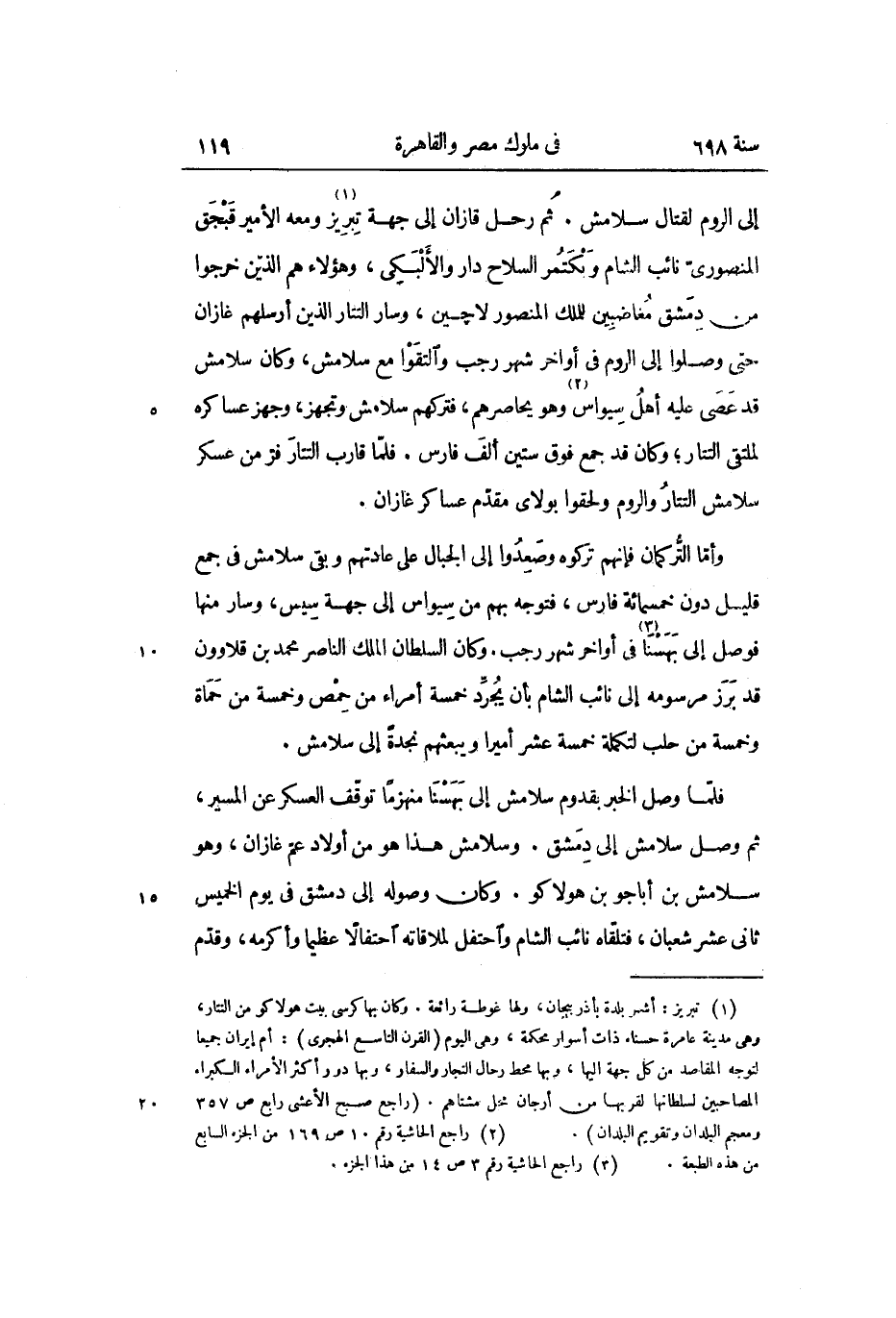 وأمّا التّركمان فإنهم تركوه وصعدوا إلى الجبال على عادتهم وبقى سلامش فى جمع قليل دون خمسمائة فارس، فتوجه بهم من سيواس إلى جهة سيس، وسار منها فوصل إلى بهسنا «3» فى أواخر شهر رجب. وكان السلطان الملك الناصر محمد بن قلاوون قد برز مرسومه إلى نائب الشام بأن يجرّد خمسة أمراء من حمص وخمسة من حماة وخمسة من حلب لتكملة خمسة عشر أميرا ويبعثهم نجدة إلى سلامش.