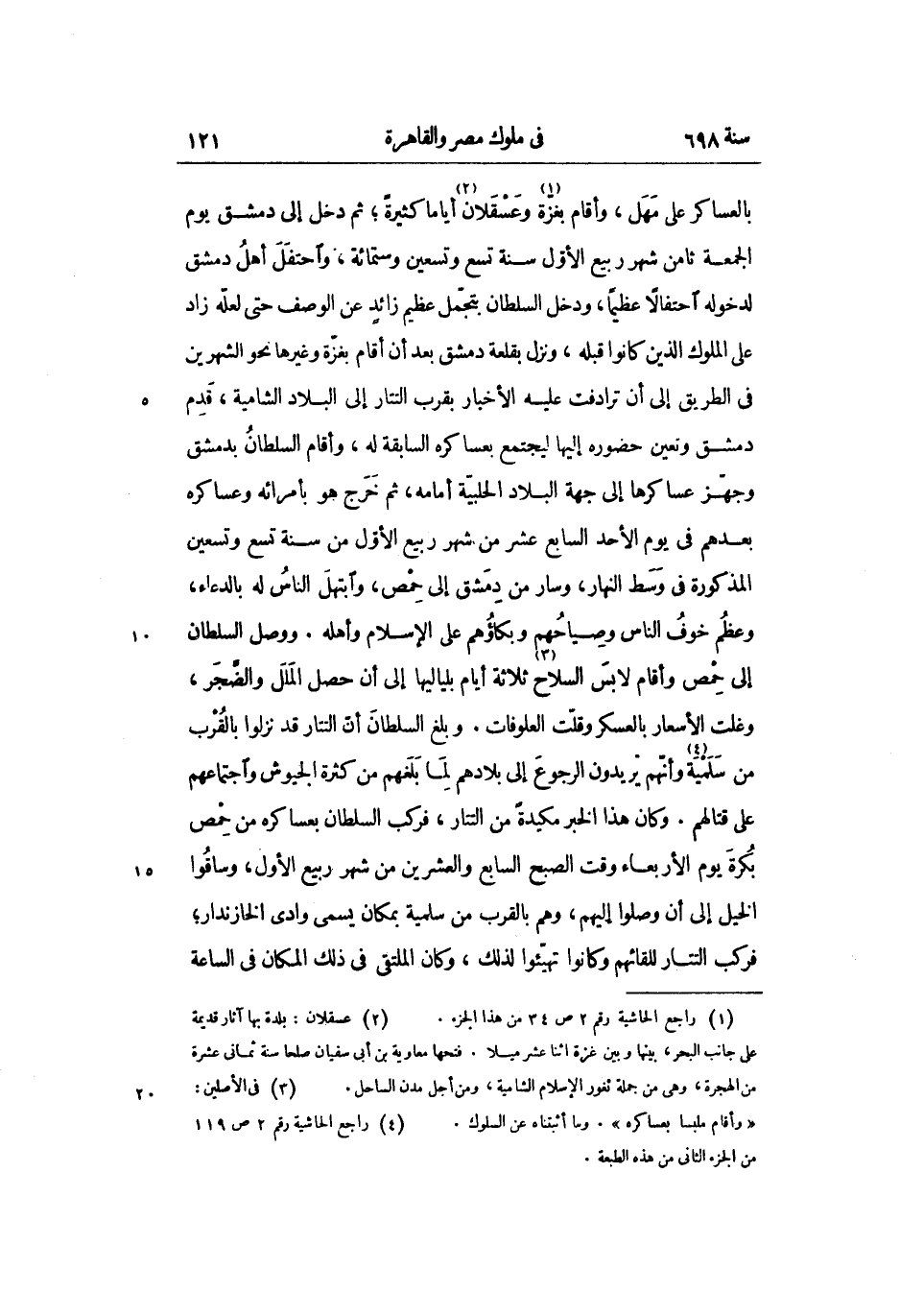 بالعساكر على مهل، وأقام بغزّة «1» وعسقلان «2» أياما كثيرة؛ ثم دخل إلى دمشق يوم الجمعة ثامن شهر ربيع الأوّل سنة تسع وتسعين وستمائة، واحتفل أهل دمشق لدخوله احتفالا عظيما، ودخل السلطان بتجمّل عظيم زائد عن الوصف حتى لعلّه زاد على الملوك الذين كانوا قبله، ونزل بقلعة دمشق بعد أن أقام بغزّة وغيرها نحو الشهرين فى الطريق إلى أن ترادفت عليه الأخبار بقرب التتار إلى البلاد الشامية، قدم دمشق وتعين حضوره إليها ليجتمع بعساكره السابقة له، وأقام السلطان بدمشق وجهّز عساكرها إلى جهة البلاد الحلبيّة أمامه، ثم خرج هو بأمرائه وعساكره بعدهم فى يوم الأحد السابع عشر من شهر ربيع الأوّل من سنة تسع وتسعين المذكورة فى وسط النهار، وسار من دمشق إلى حمص، وابتهل الناس له بالدعاء، وعظم خوف الناس وصياحهم وبكاؤهم على الإسلام وأهله. ووصل السلطان إلى حمص وأقام لابس السلاح «3» ثلاثة أيام بلياليها إلى أن حصل الملل والضّجر، وغلت الأسعار بالعسكر وقلّت العلوفات. وبلغ السلطان أنّ التتار قد نزلوا بالقرب من سلمية «4» وأنّهم يريدون الرجوع إلى بلادهم لما بلغهم من كثرة الجيوش واجتماعهم على قتالهم. وكان هذا الخبر مكيدة من التتار، فركب السلطان بعساكره من حمص بكرة يوم الأربعاء وقت الصبح السابع والعشرين من شهر ربيع الأول، وساقوا الخيل إلى أن وصلوا إليهم، وهم بالقرب من سلمية بمكان يسمى وادى الخازندار؛ فركب التتار للقائهم وكانوا تهيّئوا لذلك، وكان الملتقى فى ذلك المكان فى الساعة
