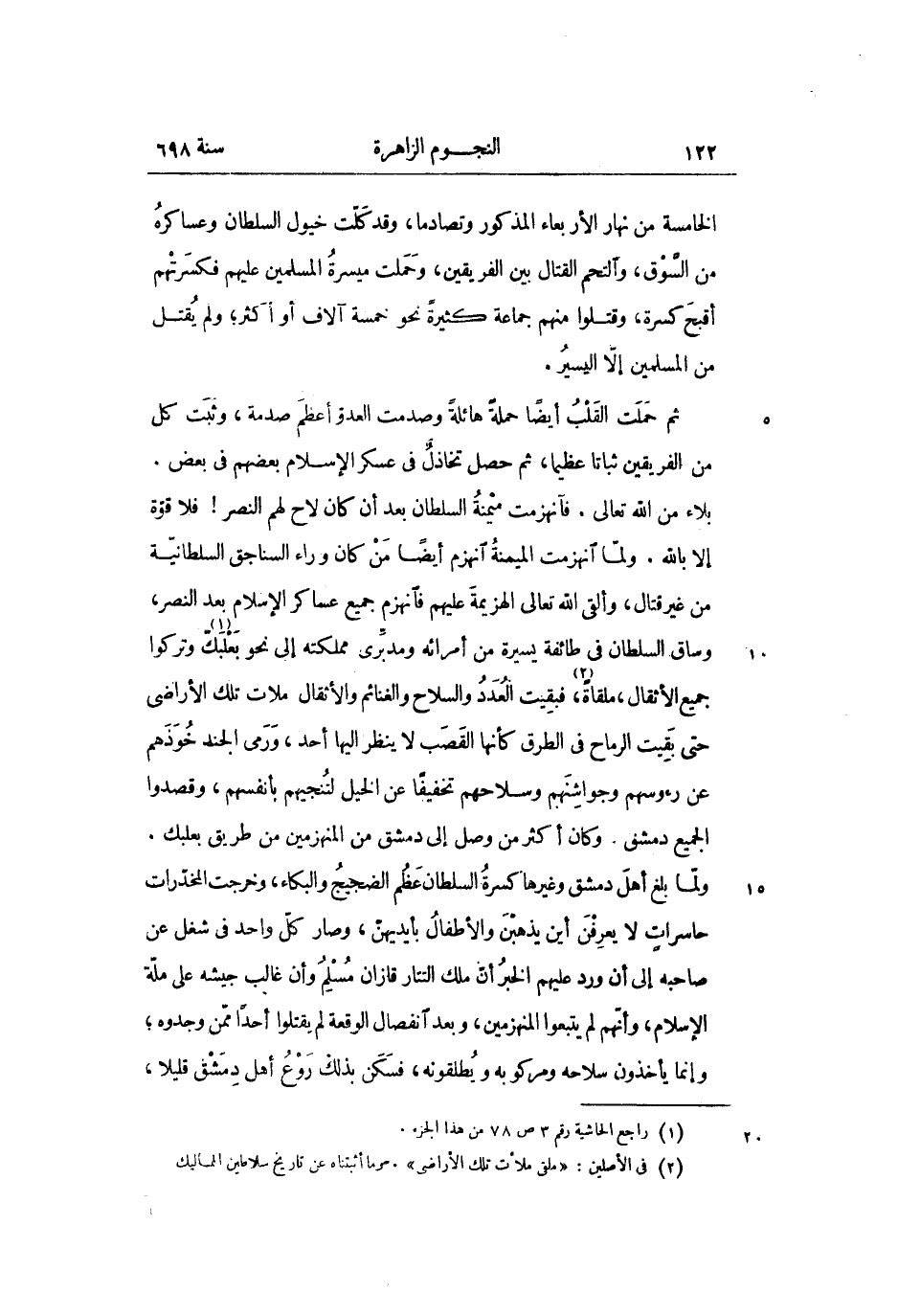 الخامسة من نهار الأربعاء المذكور وتصادما، وقد كلّت خيول السلطان وعساكره من السّوق، والتحم القتال بين الفريقين، وحملت ميسرة المسلمين عليهم فكسرتهم أقبح كسرة، وقتلوا منهم جماعة كثيرة نحو خمسة آلاف أو أكثر؛ ولم يقتل من المسلمين إلّا اليسير.