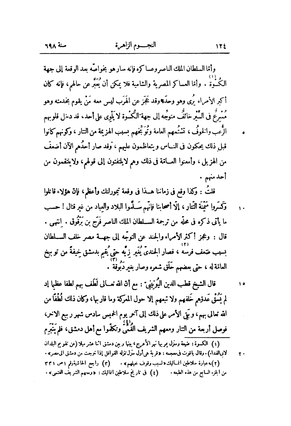 قلت: وكذا وقع فى زماننا هذا فى وقعة تيمور لنك وأعظم، فإنّ هؤلاء قاتلوا وكسروا ميمنة التّتار، إلّا أصحابنا فإنّهم سلّموا البلاد والعباد من غير قتال! حسب ما يأتى ذكره فى محلّه من ترجمة السلطان الملك الناصر فرج بن برقوق. انتهى.
