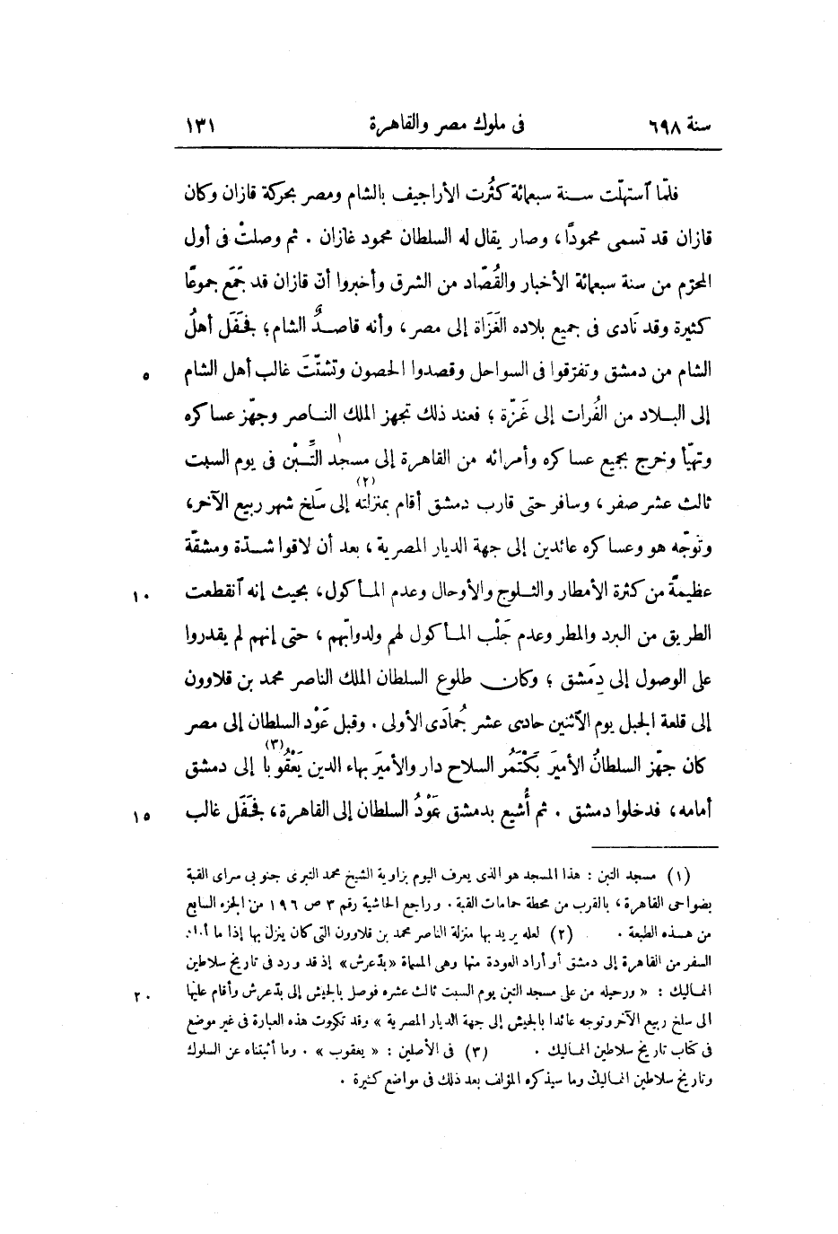 فلمّا استهلّت سنة سبعمائة كثرت الأراجيف بالشام ومصر بحركة قازان وكان قازان قد تسمى محمودا، وصار يقال له السلطان محمود غازان. ثم وصلت فى أول المحرّم من سنة سبعمائة الأخبار والقصّاد من الشرق وأخبروا أنّ قازان قد جمع جموعا كثيرة وقد نادى فى جميع بلاده الغزاة إلى مصر، وأنه قاصد الشام؛ فجفل أهل الشام من دمشق وتفرّقوا فى السواحل وقصدوا الحصون وتشتّت غالب أهل الشام إلى البلاد من الفرات إلى غزّة؛ فعند ذلك تجهز الملك الناصر وجهّز عساكره وتهيّأ وخرج بجميع عساكره وأمرائه من القاهرة إلى مسجد التّبن «1» فى يوم السبت ثالث عشر صفر، وسافر حتى قارب دمشق أقام بمنزلته «2» إلى سلخ شهر ربيع الآخر، وتوجّه هو وعساكره عائدين إلى جهة الديار المصرية، بعد أن لاقوا شدّة ومشقّة عظيمة من كثرة الأمطار والثلوج والأوحال وعدم المأكول، بحيث إنه انقطعت الطريق من البرد والمطر وعدم جلب المأكول لهم ولدوابّهم، حتى إنهم لم يقدروا على الوصول إلى دمشق؛ وكان طلوع السلطان الملك الناصر محمد بن قلاوون إلى قلعة الجبل يوم الاثنين حادى عشر جمادى الأولى. وقبل عود السلطان إلى مصر كان جهّز السلطان الأمير بكتمر السلاح دار والأمير بهاء الدين يعقوبا «3» إلى دمشق أمامه، فدخلوا دمشق. ثم أشيع بدمشق عود السلطان إلى القاهرة، فجفل غالب