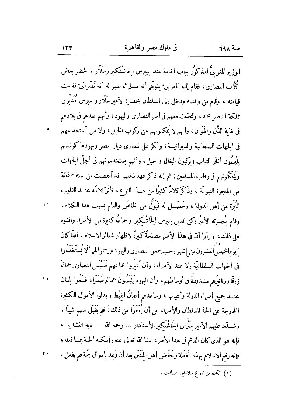 الوزير المغربىّ المذكور بباب القلعة عند بيبرس الجاشنكير وسلّار. فحضر بعض كتّاب النصارى، فقام إليه المغربىّ يتوهّم أنه مسلم ثم ظهر له أنه نصرانىّ فقامت قيامته، وقام من وقته ودخل إلى السلطان بحضرة الأمير سلّار وبيبرس مدبّرى مملكة الناصر محمد، وتحدّث معهم فى أمر النصارى واليهود، وأنهم عندهم فى بلادهم فى غاية الذّل والهوان، وأنهم لا يمكنونهم من ركوب الخيل، ولا من استخدامهم فى الجهات السلطانية والديوانية، وأنكر على نصارى ديار مصر ويهودها كونهم يلبسون أفخر الثياب ويركبون البغال والخيل، وأنهم يستخدمونهم فى أجلّ الجهات ويحكّمونهم فى رقاب المسلمين؛ ثم إنه ذكر عهد ذمّتهم قد انقضت من سنة ستمائة من الهجرة النبويّة، وذكر كلاما كثيرا من هذا النوع، فأثّر كلامه عند القلوب النّيّرة من أهل الدولة، وحصل له قبول من الخاصّ والعام بسبب هذا الكلام، وقام بنصرته الأمير ركن الدين بيبرس الجاشنكير وجماعة كثيرة من الأمراء وافقوه على ذلك، ورأوا أنّ فى هذا الأمر مصلحة كبيرة لاظهار شعائر الاسلام. فلمّا كان [يوم الخميس «1» العشرون من] شهر رجب جمعوا النصارى واليهود ورسموا لهم ألّا يستخدموا فى الجهات السلطانيّة ولا عند الأمراء، وأن يغيّروا عمائمهم فيلبس النصارى عمائم زرقا وزنانيرهم مشدودة فى أوساطهم؛ وأنّ اليهود يلبسون عمائم صفرا، فسعوا الملّتان عند جميع أمراء الدولة وأعيانها، وساعدهم أعيان القبط وبذلوا الأموال الكثيرة الخارجة عن الحدّ للسلطان والأمراء على أن يعفوا من ذلك، فلم يقبل منهم شيئا.