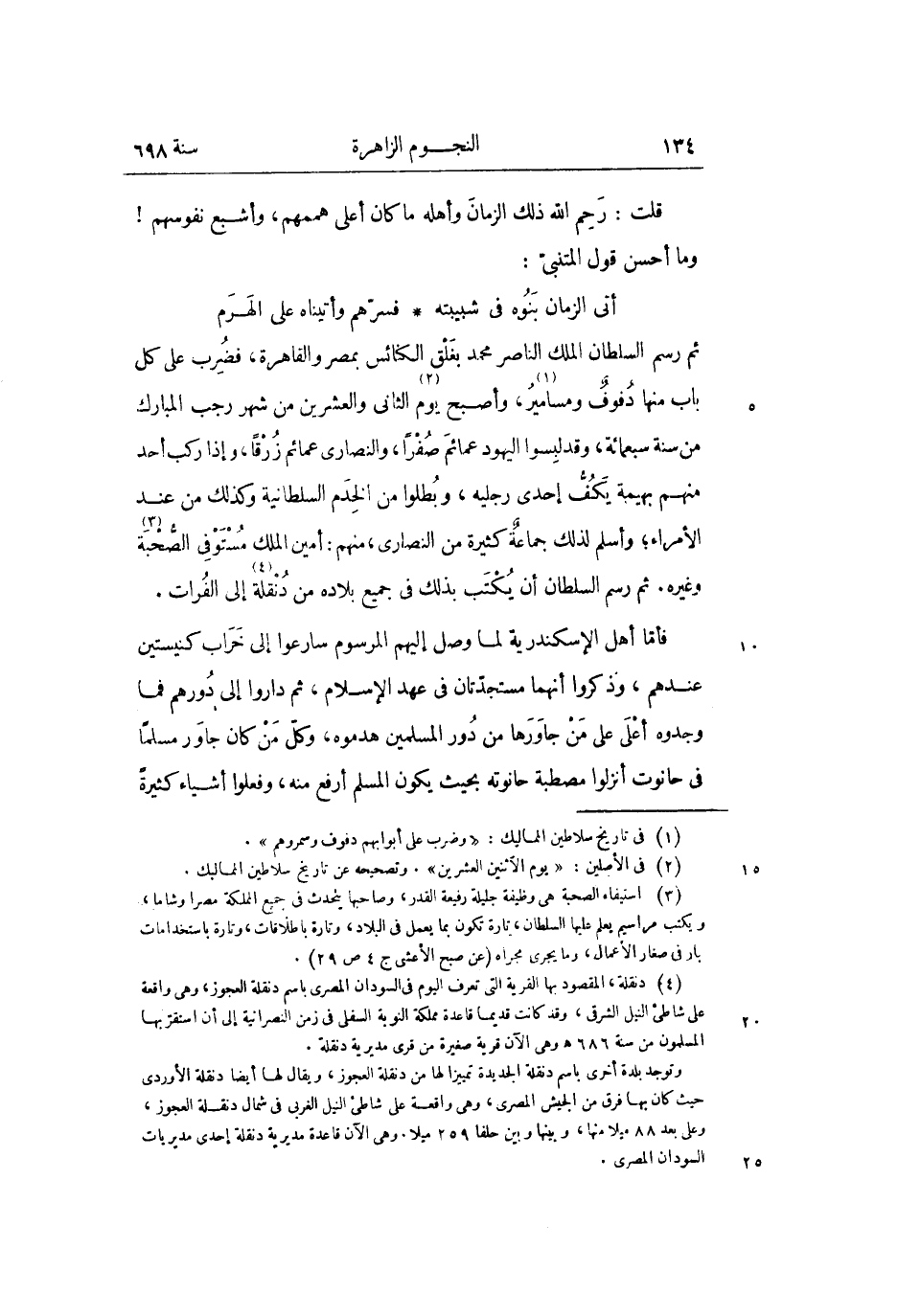 ثم رسم السلطان الملك الناصر محمد بغلق الكنائس بمصر والقاهرة، فضرب على كل باب منها دفوف ومسامير «1» ، وأصبح يوم «2» الثانى والعشرين من شهر رجب المبارك من سنة سبعمائة، وقد لبسوا اليهود عمائم صفرا، والنصارى عمائم زرقا، وإذا ركب أحد منهم بهيمة يكفّ إحدى رجليه، وبطلوا من الخدم السلطانية وكذلك من عند الأمراء؛ وأسلم لذلك جماعة كثيرة من النصارى، منهم: أمين الملك مستوفى الصّحبة «3» وغيره. ثم رسم السلطان أن يكتب بذلك فى جميع بلاده من دنقلة «4» إلى الفرات.