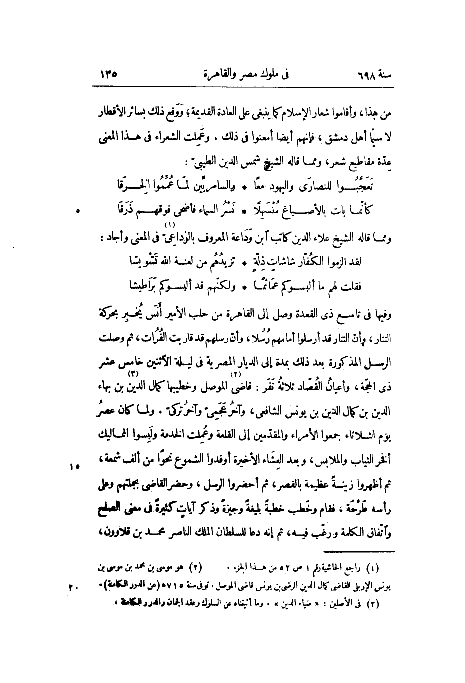 وفيها فى تاسع ذى القعدة وصل إلى القاهرة من حلب الأمير أنس يخبر بحركة التتار، وأنّ التتار قد أرسلوا أمامهم رسلا، وأنّ رسلهم قد قاربت الفرات، ثم وصلت الرسل المذكورة بعد ذلك بمدة إلى الديار المصرية فى ليلة الاثنين خامس عشر ذى الحجّة، وأعيان القصّاد ثلاثة نفر: قاضى «2» الموصل وخطيبها كمال الدين «3» بن بهاء الدين بن كمال الدين بن يونس الشافعى، وآخر عجمىّ وآخر تركىّ. ولما كان عصر يوم الثلاثاء جمعوا الأمراء والمقدّمين إلى القلعة وعملت الخدمة ولبسوا المماليك أفخر الثياب والملابس، وبعد العشاء الأخيرة أوقدوا الشموع نحوا من ألف شمعة، ثم أظهروا زينة عظيمة بالقصر، ثم أحضروا الرسل، وحضر القاضى بجملتهم وعلى رأسه طرحة، فقام وخطب خطبة بليغة وجيزة وذكر آيات كثيرة فى معنى الصلح واتّفاق الكلمة ورغّب فيه، ثم إنه دعا للسلطان الملك الناصر محمد بن قلاوون،