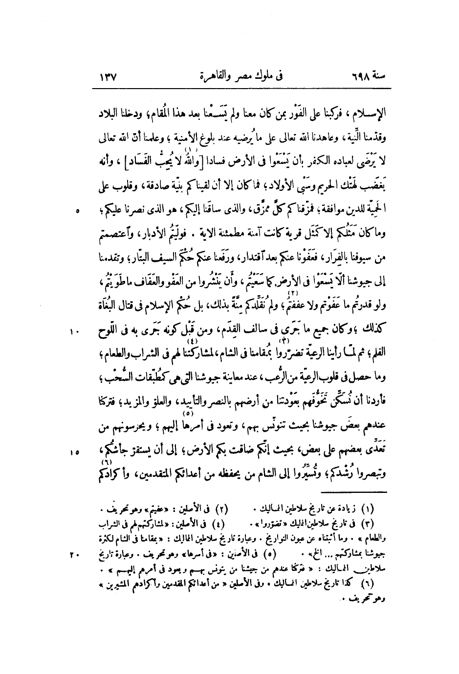 الإسلام، فركبنا على الفور بمن كان معنا ولم يسعنا بعد هذا المقام؛ ودخلنا البلاد وقدّمنا النّية، وعاهدنا الله تعالى على ما يرضيه عند بلوغ الأمنية؛ وعلمنا أنّ الله تعالى لا يرضى لعباده الكفر بأن يسعوا فى الأرض فسادا [والله «1» لا يحبّ الفساد] ، وأنه يغضب لهتك الحريم وسبى الأولاد؛ فما كان إلا أن لقيناكم بنيّة صادقة، وقلوب على الحميّة للدين موافقة؛ فمزّقنا كم كلّ ممزّق، والذي ساقنا إليكم، هو الذي نصرنا عليكم؛ وما كان مثلكم إلا كمثل قرية كانت آمنة مطمئنة الآية. فولّيتم الأدبار، واعتصمتم من سيوفنا بالفرار، فعفونا عنكم بعد اقتدار، ورفعنا عنكم حكم السيف البتّار؛ وتقدمنا إلى جيوشنا ألّا يسعوا فى الأرض كما سعيتم، وأن ينشروا من العفو والعفاف ما طويتم، ولو قدرتم ما عفوتم ولا عففتم «2» ؛ ولم نقلّدكم منّة بذلك، بل حكم الإسلام فى قتال البغاة كذلك؛ وكان جميع ما جرى فى سالف القدم، ومن قبل كونه جرى به فى اللّوح القلم؛ ثم لمّا رأينا الرعيّة تضرّروا «3» بمقامنا فى الشام، لمشاركتنا «4» لهم فى الشراب والطعام؛ وما حصل فى قلوب الرعيّة من الرّعب، عند معاينة جيوشنا التى هى كمطبّقات السّحب؛ فأردنا أن نسكّن تخوّفهم بعودتنا من أرضهم بالنصر والتأييد، والعلوّ والمزيد؛ فتركنا عندهم بعض جيوشنا بحيث تنونّس بهم، وتعود فى أمرها «5» إليهم؛ ويحرسونهم من تعدّى بعضهم على بعض، بحيث إنّكم ضاقت بكم الأرض؛ إلى أن يستقرّ جأشكم، وتبصروا رشدكم؛ وتسيّروا إلى الشام من يحفظه من أعدائكم المتقدمين، وأكرادكم «6»