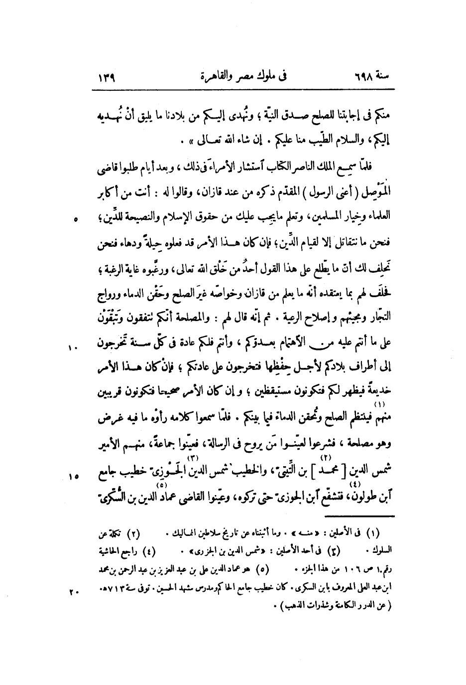 فلمّا سمع الملك الناصر الكتاب استشار الأمراء فى ذلك، وبعد أيام طلبوا قاضى الموصل (أعنى الرسول) المقدّم ذكره من عند قازان، وقالوا له: أنت من أكابر العلماء وخيار المسلمين، وتعلم ما يجب عليك من حقوق الإسلام والنصيحة للدّين؛ فنحن ما نتقاتل إلا لقيام الدّين؛ فإن كان هذا الأمر قد فعلوه حيلة ودهاء فنحن نحلف لك أنّ ما يطّلع على هذا القول أحد من خلق الله تعالى، ورغّبوه غاية الرغبة؛ فخلف لهم بما يعتقده أنّه ما يعلم من قازان وخواصّه غير الصلح وحقن الدماء ورواج التجّار ومجيئهم وإصلاح الرعية. ثم إنّه قال لهم: والمصلحة أنّكم تتفقون وتبقون على ما أنتم عليه من الاهتمام بعدوّكم، وأنتم فلكم عادة فى كلّ سنة تخرجون إلى أطراف بلادكم لأجل حفظها فتخرجون على عادتكم؛ فإن كان هذا الأمر خديعة فيظهر لكم فتكونون مستيقظين؛ وإن كان الأمر صحيحا فتكونون قريبين منهم «1» فينتظم الصلح وتحقن الدماء فيما بينكم. فلمّا سمعوا كلامه رأوه ما فيه غرض وهو مصلحة، فشرعوا لعيّنوا من يروح فى الرسالة، فعيّنوا جماعة، منهم الأمير شمس الدين [محمد «2» ] بن التّيتىّ، والخطيب شمس الدين «3» الجوزىّ خطيب جامع ابن طولون «4» ، فتشفّع ابن الجوزىّ حتى تركوه، وعيّنوا القاضى عماد «5» الدين بن السّكّرىّ