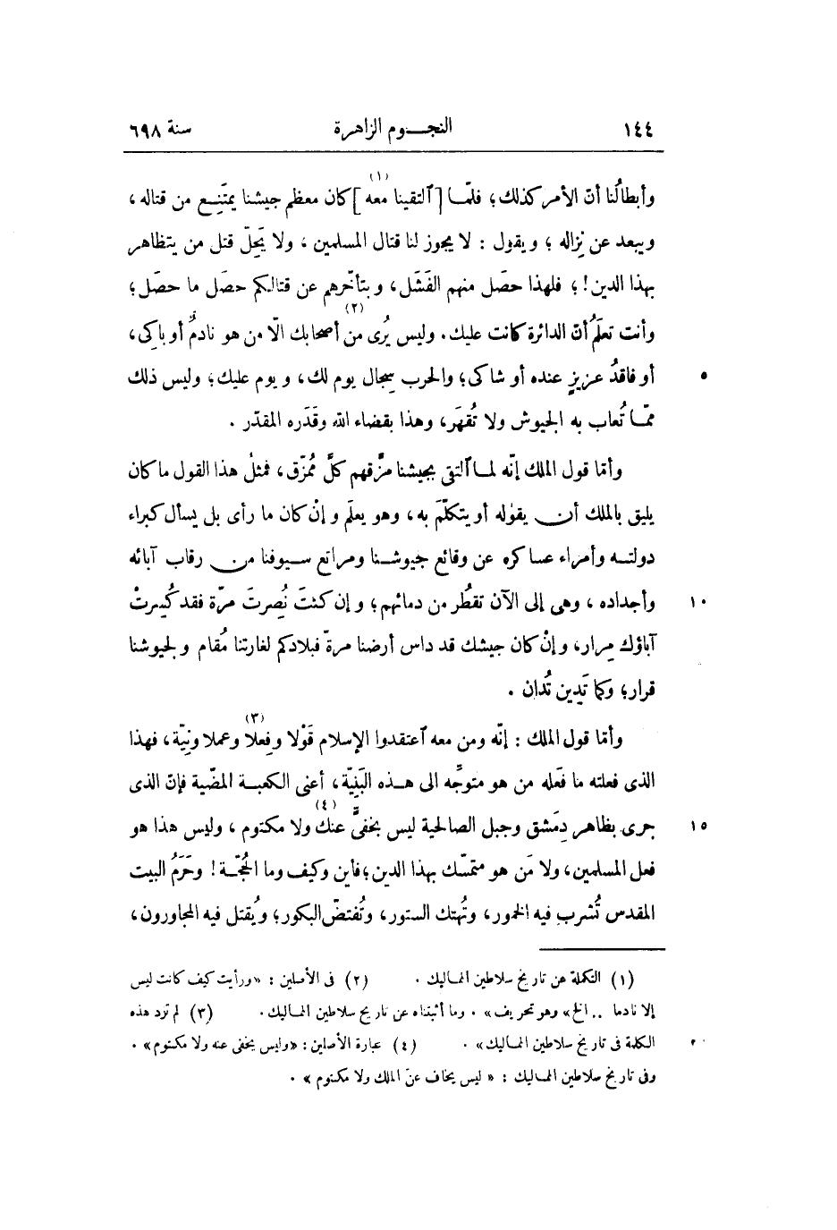 وأمّا قول الملك إنّه لما التقى بجيشنا مزّقهم كلّ ممزّق، فمثل هذا القول ما كان يليق بالملك أن يقوله أو يتكلّم به، وهو يعلم وإن كان ما رأى بل يسأل كبراء دولته وأمراء عساكره عن وقائع جيوشنا ومراتع سيوفنا من رقاب آبائه وأجداده، وهى إلى الآن تقطر من دمائهم؛ وإن كنت نصرت مرّة فقد كسرت آباؤك مرار، وإن كان جيشك قد داس أرضنا مرّة فبلادكم لغارتنا مقام ولجيوشنا قرار؛ وكما تدين تدان.