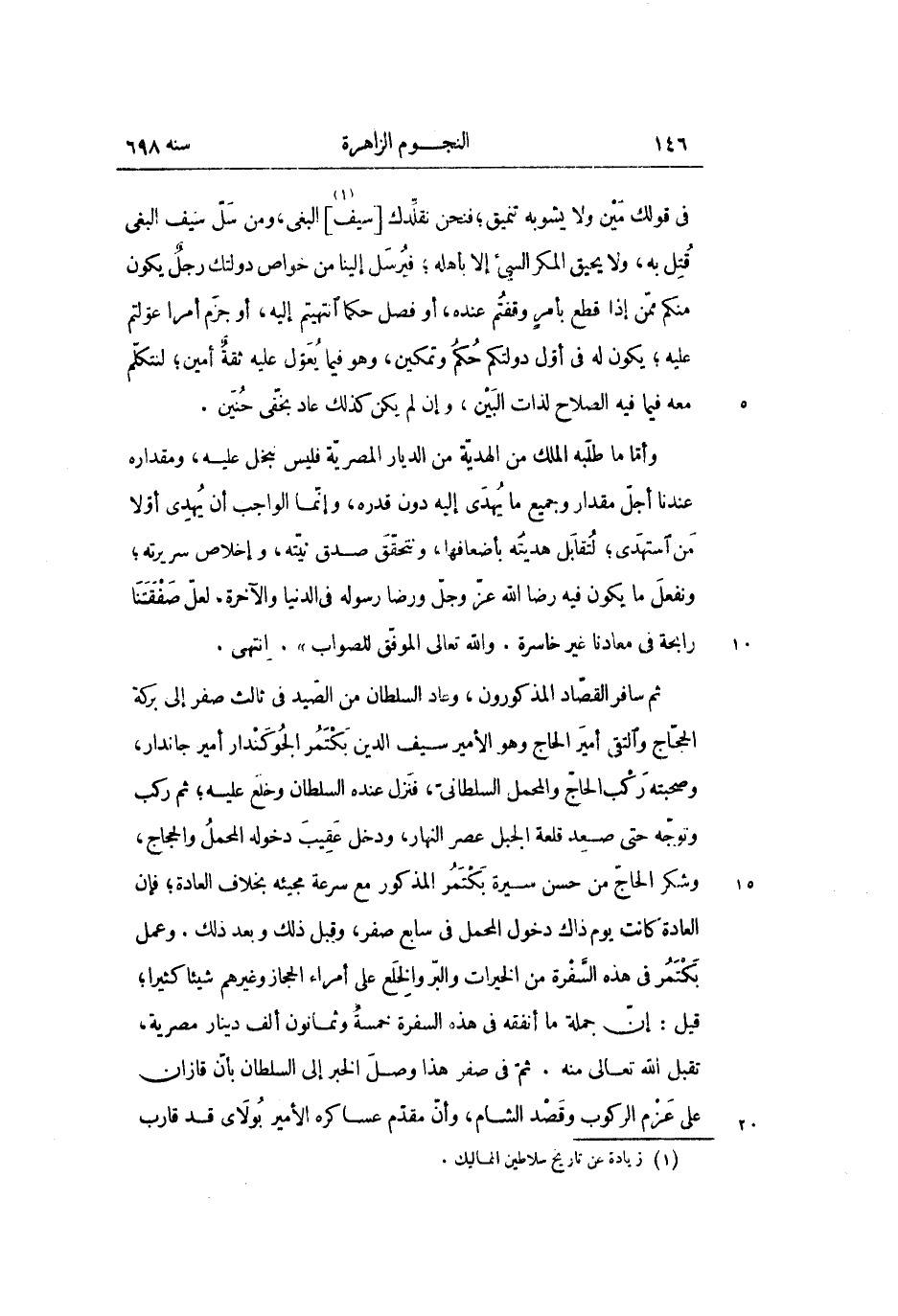 ثم سافر القصّاد المذكورون، وعاد السلطان من الصّيد فى ثالث صفر إلى بركة الحجّاج والتقى أمير الحاج وهو الأمير سيف الدين بكتمر الجوكندار أمير جاندار، وصحبته ركب الحاجّ والمحمل السلطانىّ، فنزل عنده السلطان وخلع عليه؛ ثم ركب وتوجّه حتى صعد قلعة الجبل عصر النهار، ودخل عقيب دخوله المحمل والحجاج، وشكر الحاجّ من حسن سيرة بكتمر المذكور مع سرعة مجيئه بخلاف العادة؛ فإن العادة كانت يوم ذاك دخول المحمل فى سابع صفر، وقبل ذلك وبعد ذلك. وعمل بكتمر فى هذه السّفرة من الخيرات والبرّ والخلع على أمراء الحجاز وغيرهم شيئا كثيرا؛ قيل: إنّ جملة ما أنفقه فى هذه السفرة خمسة وثمانون ألف دينار مصرية، تقبل الله تعالى منه. ثمّ فى صفر هذا وصل الخبر إلى السلطان بأنّ قازان على عزم الركوب وقصد الشام، وأنّ مقدّم عساكره الأمير بولاى قد قارب