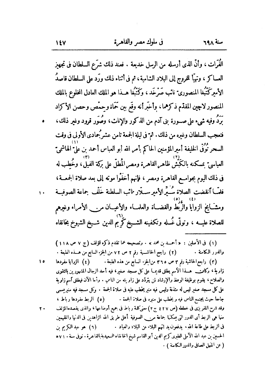 الفرات، وأنّ الذي أرسله من الرسل خديعة. فعند ذلك شرع السلطان فى تجهيز العساكر، وتهيّأ للخروج إلى البلاد الشامية، ثم فى أثناء ذلك ورد على السلطان قاصد الأمير كتبغا المنصورىّ نائب صرخد، وكتبغا هذا هو الملك العادل المخلوع بالملك المنصور لاچين المقدّم ذكرهما، وأخبر أنه وقع بين حماة وحمص وحصن الأكراد برد وفيه شىء على صورة بنى آدم من الذكور والإناث، وصور قرود وغير ذلك، فتعجب السلطان وغيره من ذلك. ثمّ فى ليلة الجمعة ثامن عشر جمادى الأولى فى وقت السحر توفّى الخليفة أمير المؤمنين الحاكم بأمر الله أبو العباس أحمد بن علىّ «1» الهاشمىّ العباسىّ بمسكنه بالكبش «2» ظاهر القاهرة ومصر المطلّ على بركة الفيل «3» ، وخطب له فى ذلك اليوم بجوامع القاهرة ومصر، فإنهم أخفوا موته إلى بعد صلاة الجمعة، فلمّا انقضت الصلاة سيّر الأمير سلّار نائب السلطنة خلف جماعة الصوفية ومشايخ الزوايا «4» والرّبط «5» والقضاة والعلماء والأعيان من الأمراء وغيرهم للصلاة عليه، وتولّى غسله وتكفينه الشيخ كريم «6» الدين شيخ الشيوخ بخانقاه