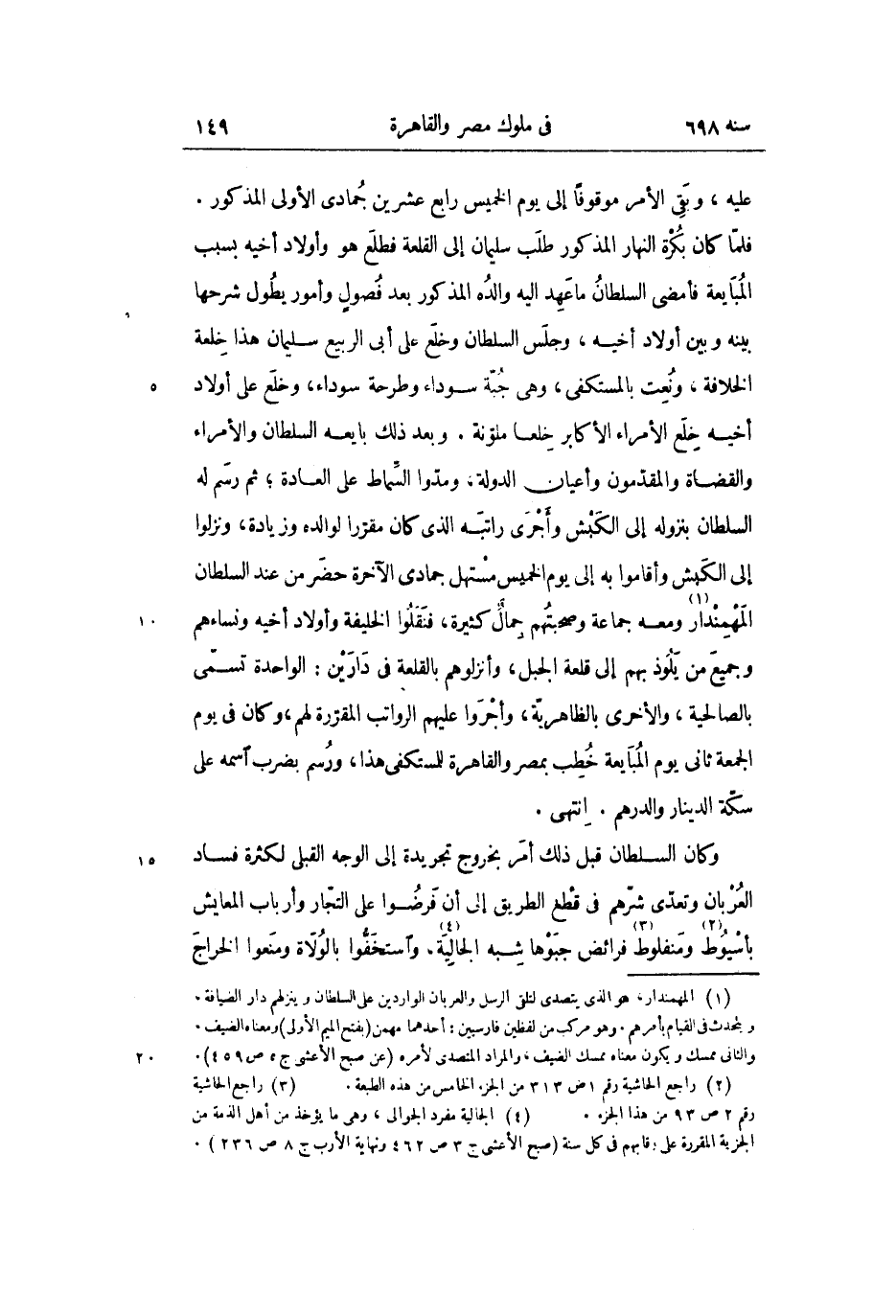 فلمّا كان بكرة النهار المذكور طلب سليمان إلى القلعة فطلع هو وأولاد أخيه بسبب المبايعة فأمضى السلطان ما عهد اليه والده المذكور بعد فصول وأمور يطول شرحها بينه وبين أولاد أخيه، وجلس السلطان وخلع على أبى الربيع سليمان هذا خلعة الخلافة، ونعت بالمستكفى، وهى جبّة سوداء وطرحة سوداء، وخلع على أولاد أخيه خلع الأمراء الأكابر خلعا ملوّنة. وبعد ذلك بايعه السلطان والأمراء والقضاة والمقدّمون وأعيان الدولة، ومدّوا السّماط على العادة؛ ثم رسم له السلطان بنزوله إلى الكبش وأجرى راتبه الذي كان مقرّرا لوالده وزيادة، ونزلوا إلى الكبش وأقاموا به إلى يوم الخميس مستهل جمادى الآخرة حضر من عند السلطان المهمندار «1» ومعه جماعة وصحبتهم جمال كثيرة، فنقلوا الخليفة وأولاد أخيه ونساءهم وجميع من يلوذ بهم إلى قلعة الجبل، وأنزلوهم بالقلعة فى دارين: الواحدة تسمّى بالصالحية، والأخرى بالظاهريّة، وأجروا عليهم الرواتب المقرّرة لهم، وكان فى يوم الجمعة ثانى يوم المبايعة خطب بمصر والقاهرة للمستكفى هذا، ورسم بضرب اسمه على سكّة الدينار والدرهم. انتهى.