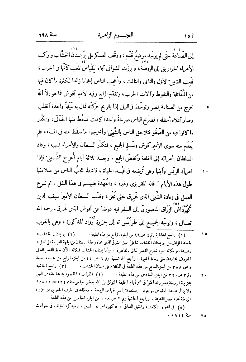إلى الصّناعة «1» حتّى لم يوجد موضع قدم، ووقف العسكر على برّ بستان «2» الخشّاب وركب الأمراء الحراريق إلى الروضة «3» ، وبرزت الشوانى تجاه المقياس «4» تلعب كأنّها فى الحرب، فلعب الشينىّ الأوّل والثانى والثالث، وأعجب الناس إعجابا زائدا لكثرة ما كان فيها من المقاتلة والنفوط وآلات الحرب، وتقدّم الرابع وفيه الأمير آقوش فما هو إلّا أنّه خرج من الصناعة بمصر وتوسّط فى النيل إذا بالريح حركّته فمال به ميلة واحدة انقلب وصار أعلاه أسفله، فصرخ الناس صرخة واحدة كادت تسقط منها الحبالى، وتكدّر ما كانوا فيه من الصّفو فتلاحق الناس بالشّينىّ وأخرجوا ما سقط منه فى الماء، فلم يعدم منه سوى الأمير آقوش وسلم الجميع، فتكدّر السلطان والأمراء بسببه، وعاد السلطان بأمرائه إلى القلعة وانفضّ الجمع. وبعد ثلاثة أيام أخرج الشّينىّ فإذا امرأة الريّس وابنها وهى ترضعه فى قيد الحياة، فاشتدّ عجب الناس من سلامتها طول هذه الأيام! قاله المقريزى وغيره، والعهدة عليهم فى هذا النقل. ثم شرع العمل فى إعادة الشّينى الذي غرق حتى نجزّ، وندب السلطان الأمير سيف الدين كهرداش «5» الزرّاق المنصورىّ إلى السفر فيه عوضا عن آقوش الذي غرق، رحمه الله تعالى، وتوجّه الجميع إلى طرابلس ثم إلى جزيرة أرواد المذكورة، وهى بالقرب