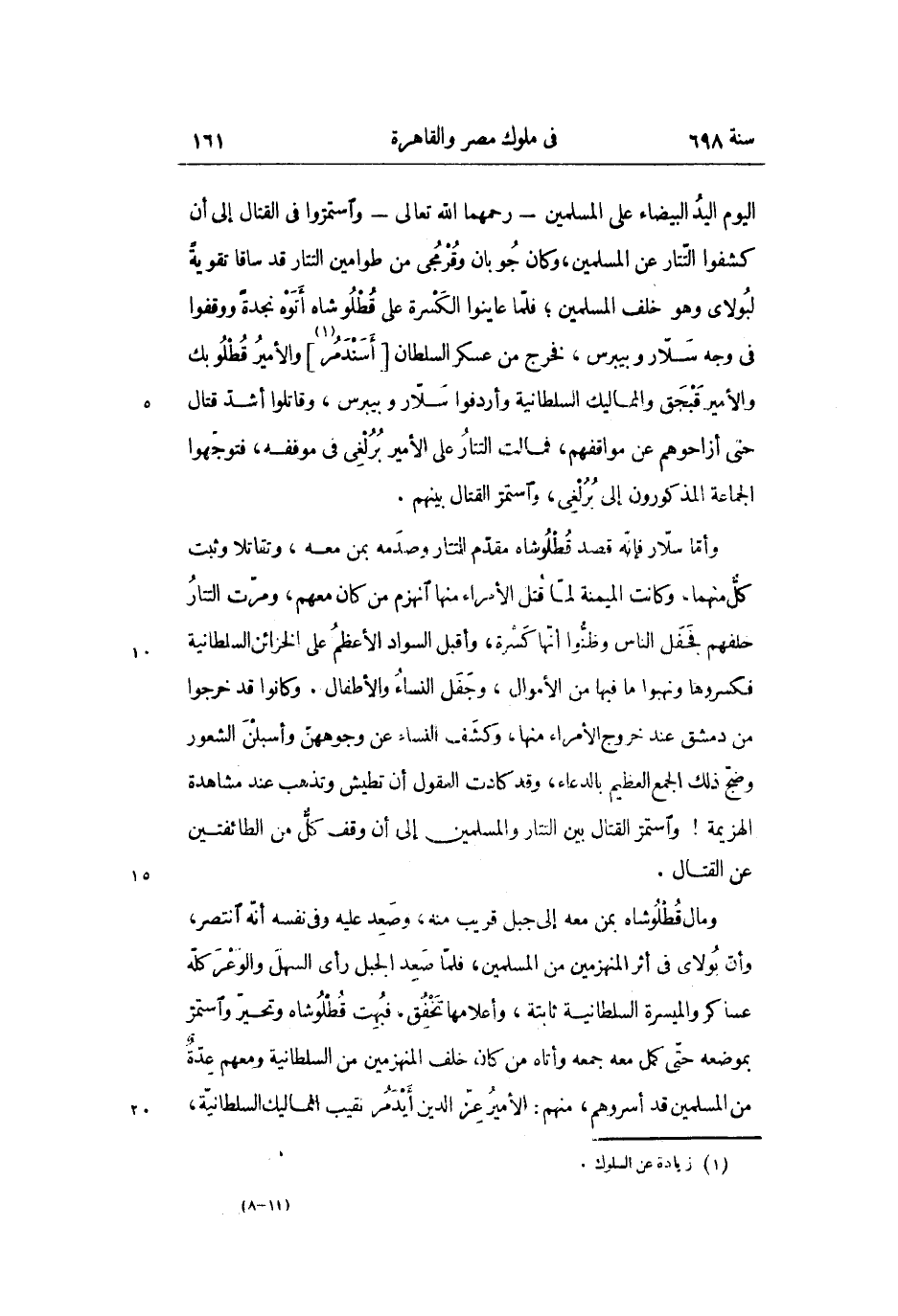 اليوم اليد البيضاء على المسلمين- رحمهما الله تعالى- واستمرّوا فى القتال إلى أن كشفوا التّتار عن المسلمين، وكان جوبان وقرمجى من طوامين التتار قد ساقا تقوية لبولاى وهو خلف المسلمين؛ فلمّا عاينوا الكسرة على قطلوشاه أتوه نجدة ووقفوا فى وجه سلّار وبيبرس، فخرج من عسكر السلطان [أسندمر «1» ] والأمير قطلوبك والأمير قبجق والمماليك السلطانية وأردفوا سلّار وبيبرس، وقاتلوا أشدّ قتال حتى أزاحوهم عن مواقفهم، فمالت التتار على الأمير برلغى فى موقفه، فتوجّهوا الجماعة المذكورون إلى برلغى، واستمرّ القتال بينهم.