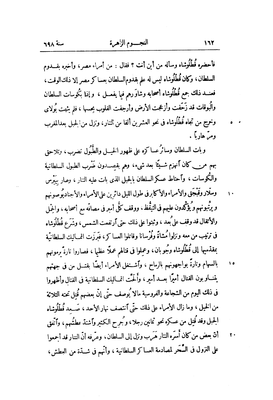 فأحضره قطلوشاه وسأله من أين أنت؟ فقال: من أمراء مصر، وأخبره بقدوم السلطان، وكان قطلوشاه ليس له علم بقدوم السلطان بعساكر مصر إلا ذلك الوقت، فعند ذلك جمع قطلوشاه أصحابه وشاورهم فيما يفعل، وإذا بكوسات السلطان والبوقات قد زحفت وأزعجت الأرض وأرجفت القلوب بحسها، فلم يثبت بولاى وخرج من تجاه قطلوشاه فى نحو العشرين ألفا من التتار، ونزل من الجبل بعد المغرب ومرّ هاربا.
