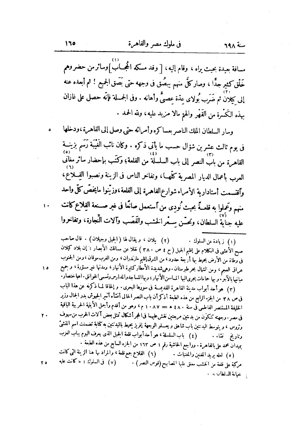 وسار السلطان الملك الناصر بعساكره وأمرائه حتى وصل إلى القاهرة، ودخلها فى يوم ثالث عشرين شوّال حسب ما يأتى ذكره. وكان نائب الغيبة رسم بزينة القاهرة من باب «3» النصر إلى باب السلسلة «4» من القلعة؛ وكتب بإحضار سائر مغانى «5» العرب بأعمال الديار المصرية كلّها، وتفاخر الناس فى الزينة ونصبوا القلاع «6» ، واقتسمت أستادارية الأمراء شوارع القاهرة إلى القلعة، وزيّنوا ما يخصّ كلّ واحد منهم وعملوا به قلعة بحيث نودى من استعمل صانعا فى غير صنعة القلاع كانت عليه جناية «7» السلطان، وتحسّن سعر الخشب والقصب وآلات النّجارة، وتفاخروا