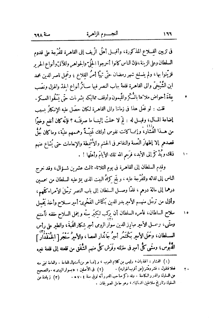 فى تزيين القلاع المذكورة، وأقبل أهل الرّيف إلى القاهرة للفرجة على قدوم السلطان وعلى الزينة، فإنّ الناس كانوا أخرجوا الحلىّ والجواهر واللآلئ وأنواع الحرير فزيّنوا بها، ولم ينسلخ شهر رمضان حتّى تهيّأ أمر القلاع؛ وعمل ناصر الدين محمد ابن الشّيخىّ والى القاهرة قلعة بباب النصر فيها سائر أنواع الجدّ والهزل ونصب عدّة أحواض ملأها بالسّكّر واللّيمون وأوقف مماليكه بشربات حتّى يسقوا العسكر.