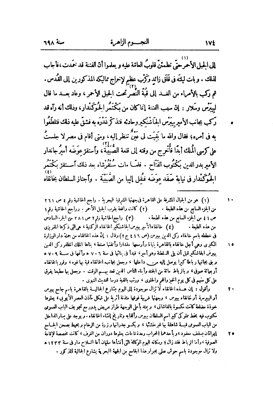 ثم ركب بالأمراء من الغد إلى قبّة النّصر «2» تحت الجبل الأحمر، وعاد بعد ما قال لبيبرس وسلار: إنّ سبب الفتنة إنما كان من بكتمر الجوكندار، وذلك أنه رآه قد ركب بجانب الأمير بيبرس الجاشنكير وحادثه فتذكّر غدره به فشقّ عليه ذلك فتلطّفوا به فى أمره؛ فقال والله ما بقيت لى عين تنظر إليه، ومتى أقام فى مصر لا جلست على كرسى الملك أبدا فأخرج من وقته إلى قلعة الصّبيبة «3» ، واستقرّ عوضه أمير جاندار الأمير بدر الدين بكتوب الفتاح. فلمّا مات سنقر شاه بعد ذلك استقرّ بكتمر الجوكندار فى نيابة صفد عوضه فنقل إليها من الصّبيبة. واجتاز السلطان بخانقاه «4»