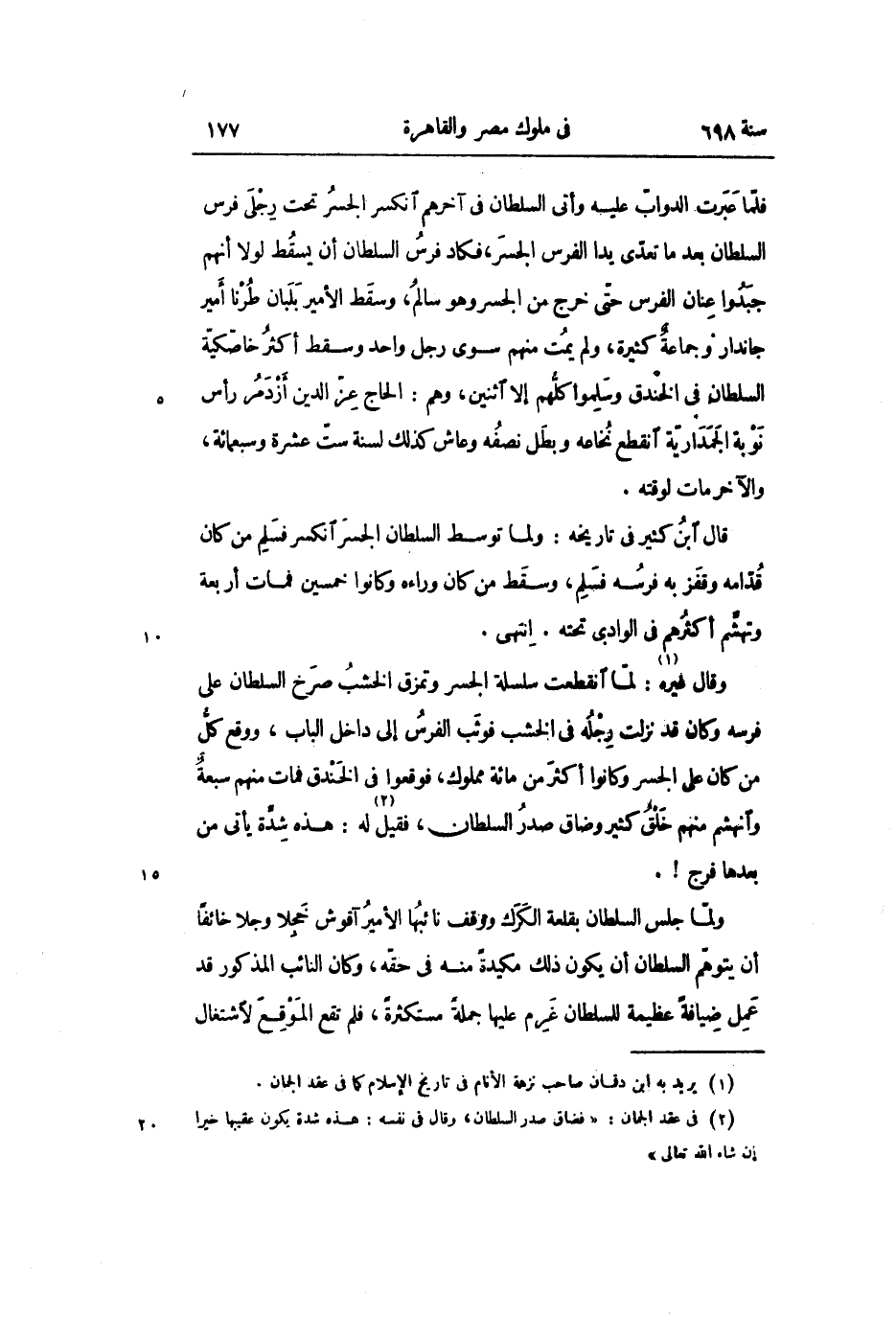 فلمّا عبرت الدوابّ عليه وأتى السلطان فى آخرهم انكسر الجسر تحت رجلى فرس السلطان بعد ما تعدّى يدا الفرس الجسر، فكاد فرس السلطان أن يسقط لولا أنهم جبدوا عنان الفرس حتّى خرج من الجسر وهو سالم، وسقط الأمير بلبان طرنا أمير جاندار وجماعة كثيرة، ولم يمت منهم سوى رجل واحد وسقط أكثر خاصّكيّة السلطان فى الخندق وسلموا كلّهم إلا اثنين، وهم: الحاج عزّ الدين أزدمر رأس نوبة الجمداريّة انقطع نخاعه وبطل نصفه وعاش كذلك لسنة ستّ عشرة وسبعمائة، والآخر مات لوقته.