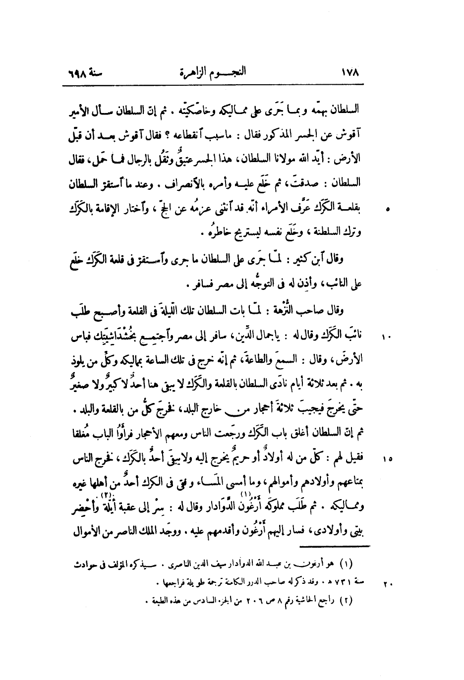 السلطان بهمّه وبما جرى على مماليكه وخاصّكيّته. ثم إنّ السلطان سأل الأمير آقوش عن الجسر المذكور فقال: ما سبب انقطاعه؟ فقال آقوش بعد أن قبّل الأرض: أيّد الله مولانا السلطان، هذا الجسر عتيق وثقل بالرجال فما حمل، فقال السلطان: صدقت، ثم خلع عليه وأمره بالانصراف. وعند ما استقرّ السلطان بقلعة الكرك عرّف الأمراء أنّه قد انثنى عزمه عن الحجّ، واختار الإقامة بالكرك وترك السلطنة، وخلع نفسه ليستريح خاطره.