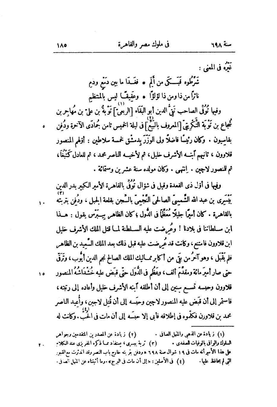 وفيها فى أوّل ذى القعدة وقيل فى شوّال توفّى بالقاهرة الأمير الكبير بدر الدين بيسرى بن عبد الله الشّمسىّ الصالحىّ النّجمىّ بالسّجن بقلعة الجبل، ودفن بتربته «3» بالقاهرة. كان أميرا جليلا معظّما فى الدّول؛ كان الظاهر بيبرس يقول: هذا ابن سلطاننا فى بلادنا! وعرضت عليه السلطنة لما قتل الملك الأشرف خليل ابن قلاوون فامتنع، وكانت قد عرضت عليه قبل ذلك بعد الملك السّعيد بن الظاهر فلم يقبل، وهو آخر من بقى من أكابر مماليك الملك الصالح نجم الدين أيّوب، وترقّى حتى صار أمير مائة ومقدّم ألف، وعظم فى الدّول حتّى قبض عليه خشداشه المنصور قلاوون وحبسه تسع سنين إلى أن أطلقه ابنه الأشرف خليل وأعاده إلى رتبته، فاستمر إلى أن قبض عليه المنصور لاچين وحبسه إلى أن قتل لاچين، وأعيد الناصر محمد بن قلاوون فكلّموه فى إطلاقه فأبى إلا حبسه إلى أن مات فى الحبّ «4» . وكانت له