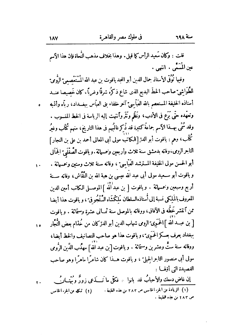وفيها توفّى الأستاذ جمال الدين أبو المجد ياقوت بن عبد الله المستعصمىّ الرّومىّ الطّواشىّ صاحب الخطّ البديع الذي شاع ذكره شرقا وغربا، كان خصيصا عند أستاذه الخليفة المستعصم بالله العبّاسىّ آخر خلفاء بنى العبّاس ببغداد، ربّاه وأدّبه وتعهّده حتّى برع فى الأدب، ونظم ونثر وانتهت إليه الرياسة فى الخط المنسوب.