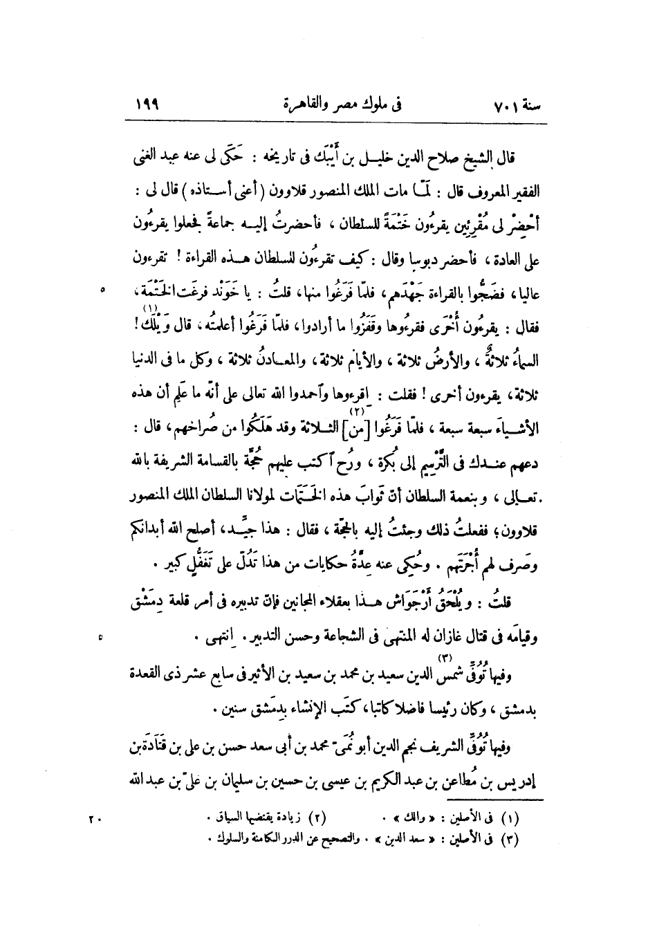 دعهم عندك فى التّرسيم إلى بكرة، ورح اكتب عليهم حجّة بالقسامة الشريفة بالله تعالى، وبنعمة السلطان أنّ ثواب هذه الختمات لمولانا السلطان الملك المنصور قلاوون؛ ففعلت ذلك وجئت إليه بالحجّة، فقال: هذا جيّد، أصلح الله أبدانكم وصرف لهم أجرتهم. وحكى عنه عدّة حكايات من هذا تدلّ على تغفّل كبير.