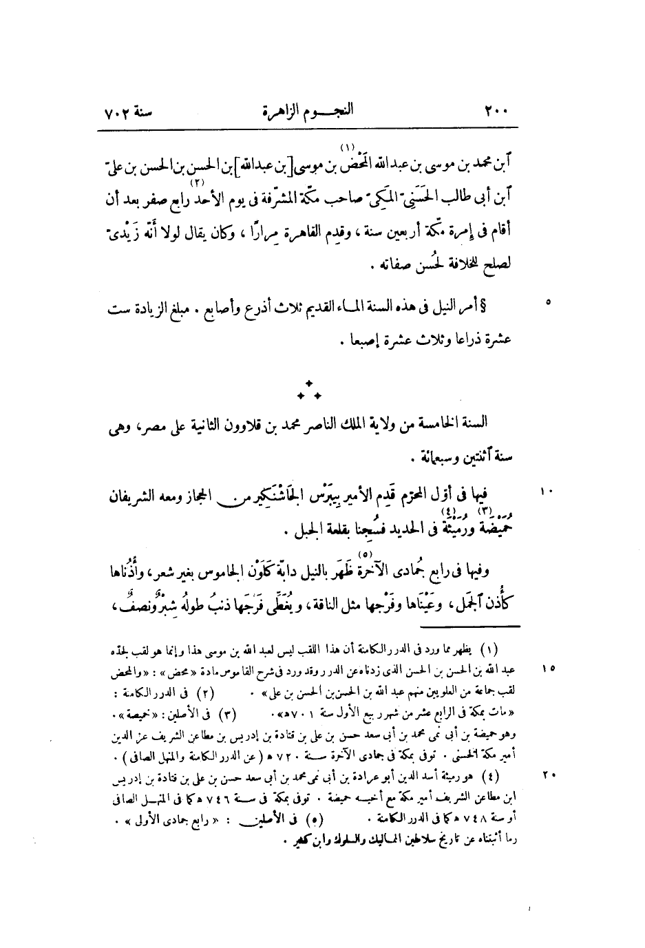 فيها فى أوّل المحرّم قدم الأمير بيبرس الجاشنكير من الحجاز ومعه الشريفان حميضة «3» ورميثة «4» فى الحديد فسجنا بقلعة الجبل.