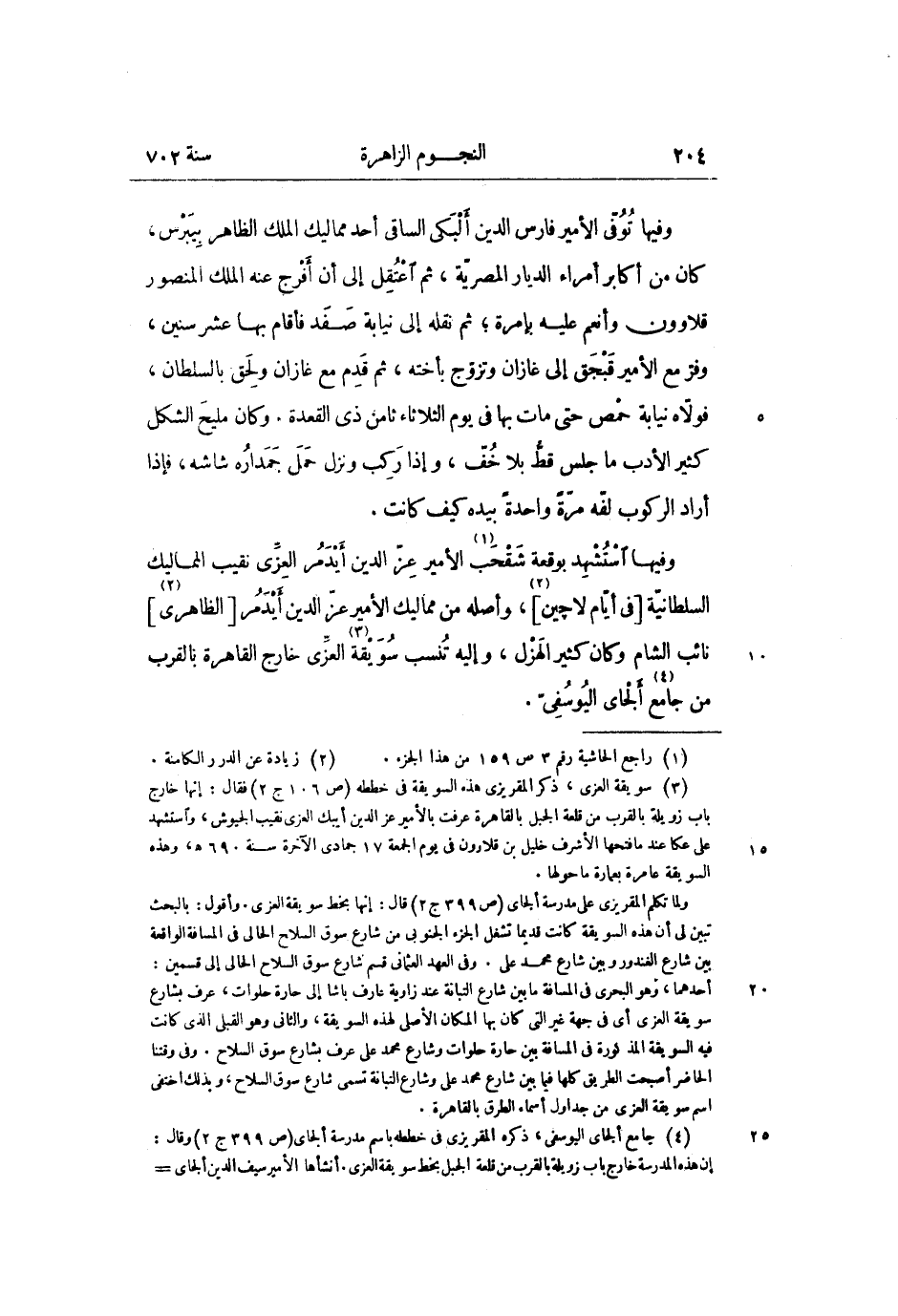 وفيها استشهد بوقعة شقحب «1» الأمير عزّ الدين أيدمر العزّى نقيب المماليك السلطانيّة [فى أيّام لاچين «2» ] ، وأصله من مماليك الأمير عزّ الدين أيدمر [الظاهرى «3» ] نائب الشام وكان كثير الهزل، وإليه تنسب سويقة «4» العزّى خارج القاهرة بالقرب من جامع «5» ألجاى اليوسفىّ.
