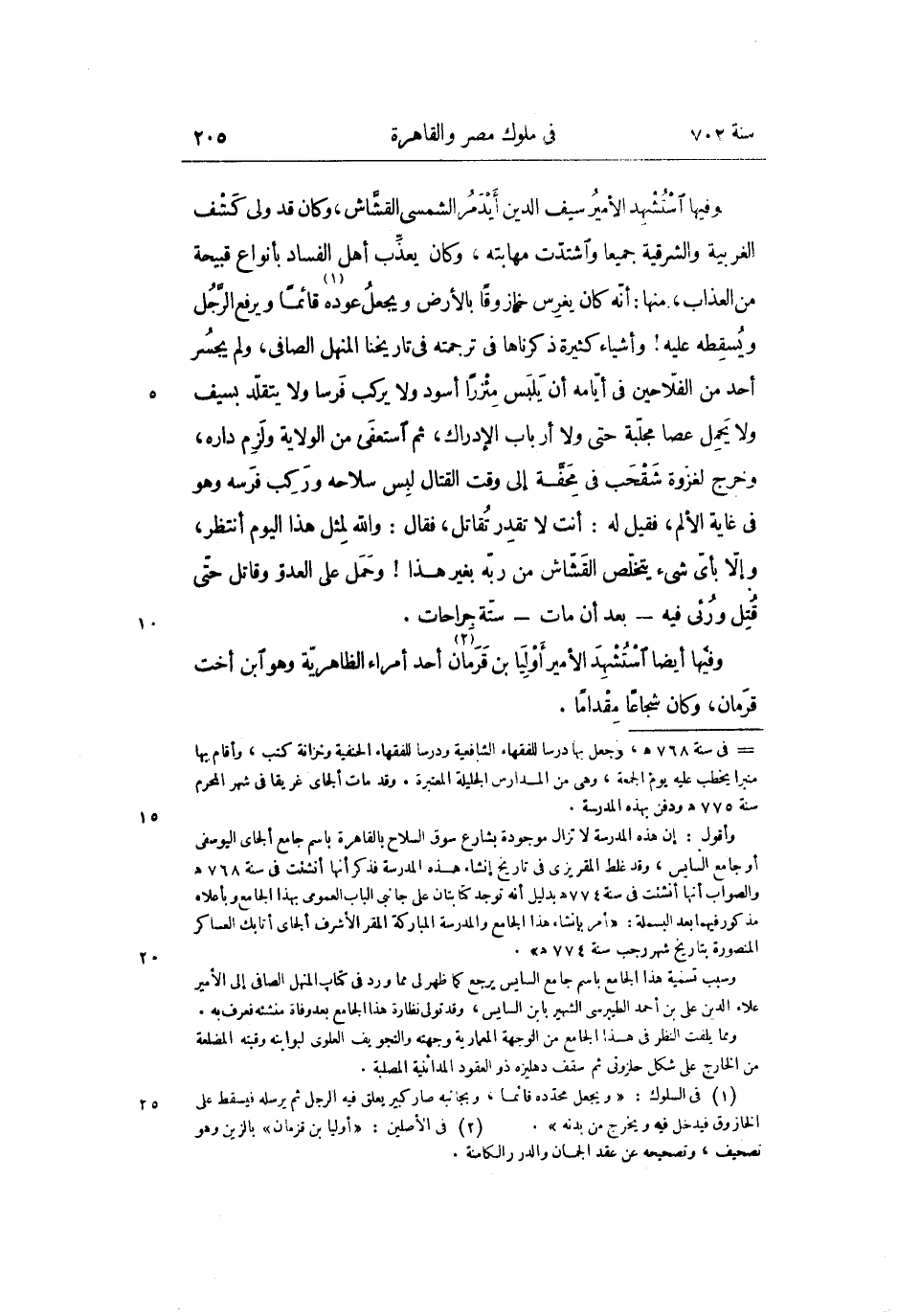 وفيها استشهد الأمير سيف الدين أيدمر الشمسى القشّاش، وكان قد ولى كشف الغربية والشرقية جميعا واشتدّت مهابته، وكان يعذّب أهل الفساد بأنواع قبيحة من العذاب، منها: أنّه كان يغرس خازوقا بالأرض ويجعل عوده «1» قائما ويرفع الرّجل ويسقطه عليه! وأشياء كثيرة ذكرناها فى ترجمته فى تاريخنا المنهل الصافى، ولم يجسر أحد من الفلّاحين فى أيّامه أن يلبس مئزرا أسود ولا يركب فرسا ولا يتقلّد بسيف ولا يحمل عصا مجلّبة حتى ولا أرباب الإدراك، ثم استعفى من الولاية ولزم داره، وخرج لغزوة شقحب فى محفّة إلى وقت القتال لبس سلاحه وركب فرسه وهو فى غاية الألم، فقيل له: أنت لا تقدر تقاتل، فقال: والله لمثل هذا اليوم أنتظر، وإلّا بأىّ شىء يتخلّص القشّاش من ربّه بغير هذا! وحمل على العدوّ وقاتل حتّى قتل ورئى فيه- بعد أن مات- ستّة جراحات.