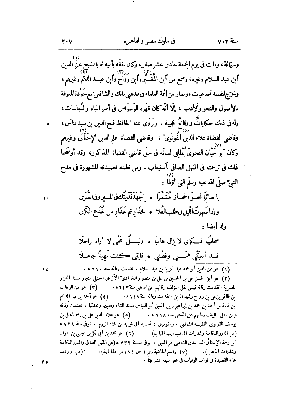 وغيرهم وكان أبو «7» حيّان النحوىّ يطلق لسانه فى حقّ قاضى القضاة المذكور، وقد أوضحنا ذلك فى ترجمته فى المنهل الصافى باستيعاب. ومن نظمه قصيدته المشهورة فى مدح النّبيّ صلّى الله عليه وسلّم التى أوّلها «8» :