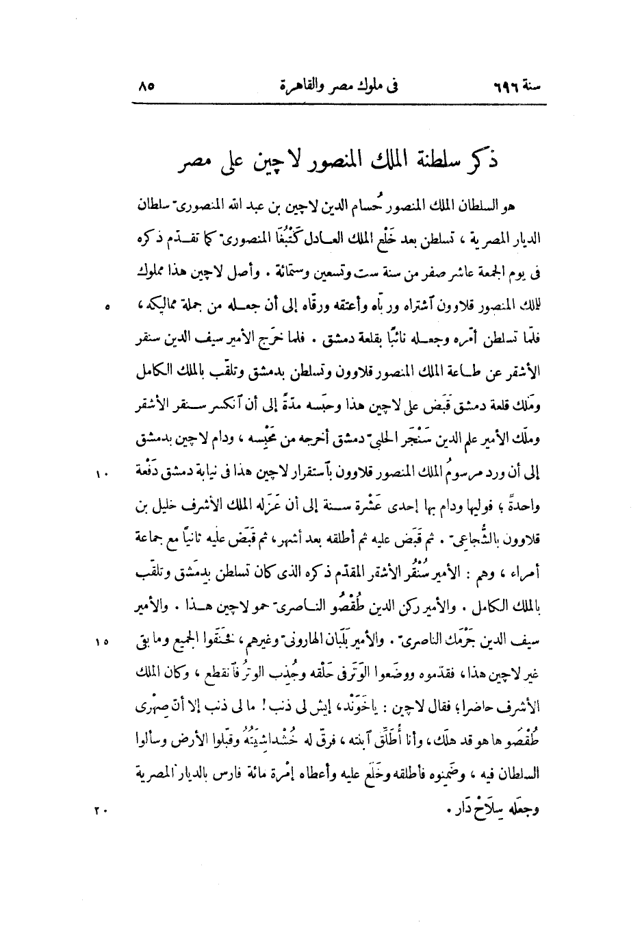 هو السلطان الملك المنصور حسام الدين لاچين بن عبد الله المنصورىّ سلطان الديار المصرية، تسلطن بعد خلع الملك العادل كتبغا المنصورىّ كما تقدّم ذكره فى يوم الجمعة عاشر صفر من سنة ست وتسعين وستمائة. وأصل لا چين هذا مملوك للملك المنصور قلاوون اشتراه وربّاه وأعتقه ورقّاه إلى أن جعله من جملة مماليكه، فلمّا تسلطن أمّره وجعله نائبا بقلعة دمشق. فلما خرج الأمير سيف الدين سنقر الأشقر عن طاعة الملك المنصور قلاوون وتسلطن بدمشق وتلقّب بالملك الكامل وملك قلعة دمشق قبض على لا چين هذا وحبسه مدّة إلى أن انكسر سنقر الأشقر وملك الأمير علم الدين سنجر الحلبىّ دمشق أخرجه من محبسه، ودام لا چين بدمشق إلى أن ورد مرسوم الملك المنصور قلاوون باستقرار لاچين هذا فى نيابة دمشق دفعة واحدة؛ فوليها ودام بها إحدى عشرة سنة إلى أن عزله الملك الأشرف خليل بن قلاوون بالشّجاعىّ. ثم قبض عليه ثم أطلقه بعد أشهر، ثم قبض عليه ثانيا مع جماعة أمراء، وهم: الأمير سنقر الأشقر المقدّم ذكره الذي كان تسلطن بدمشق وتلقّب بالملك الكامل. والأمير ركن الدين طقصو الناصرىّ حمو لاچين هذا. والأمير سيف الدين جرمك الناصرىّ. والأمير بلبان الهارونىّ وغيرهم، فحنقوا الجميع وما بقى غير لاچين هذا، فقدّموه ووضعوا الوتر فى حلقه وجذب الوتر فانقطع، وكان الملك الأشرف حاضرا؛ فقال لاچين: ياخوند، إيش لى ذنب! ما لى ذنب إلا أنّ صهرى طقصوها هو قد هلك، وأنا أطلّق ابنته، فرقّ له خشداشيته وقبّلوا الأرض وسألوا السلطان فيه، وضمنوه فأطلقه وخلع عليه وأعطاه إمرة مائة فارس بالديار المصرية وجعله سلاح دار.