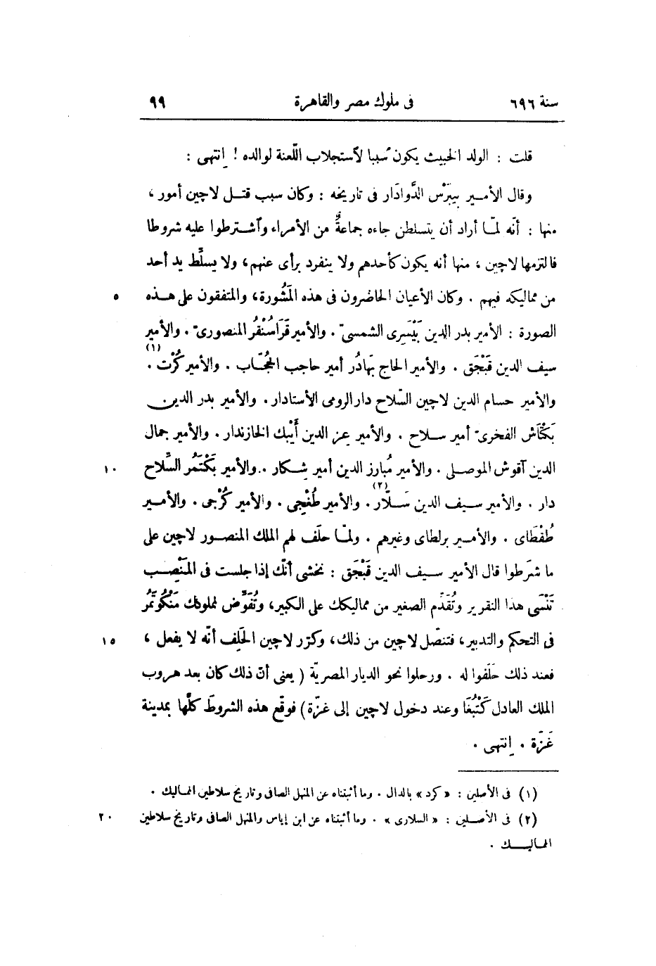 والأمير حسام الدين لاچين السّلاح دار الرومى الأستادار. والأمير بدر الدين بكتاش الفخرىّ أمير سلاح. والأمير عز الدين أيبك الخازندار. والأمير جمال الدين آقوش الموصلى. والأمير مبارز الدين أمير شكار. والأمير بكتمر السّلاح دار. والأمير سيف الدين سلّار «2» . والأمير طغجى. والأمير كرجى. والأمير طقطاى. والأمير برلطاى وغيرهم. ولمّا حلف لهم الملك المنصور لاچين على ما شرطوا قال الأمير سيف الدين قبجق: نخشى أنّك إذا جلست فى المنصب تنسى هذا التقرير وتقدّم الصغير من مماليكك على الكبير، وتفوّض لمملوك منكوتمر فى التحكم والتدبير، فتنصّل لاچين من ذلك، وكرّر لاچين الحلف أنّه لا يفعل، فعند ذلك حلفوا له. ورحلوا نحو الديار المصريّة (يعنى أنّ ذلك كان بعد هروب الملك العادل كتبغا وعند دخول لاچين إلى غزّة) فوقّع هذه الشروط كلّها بمدينة غزّة. انتهى.