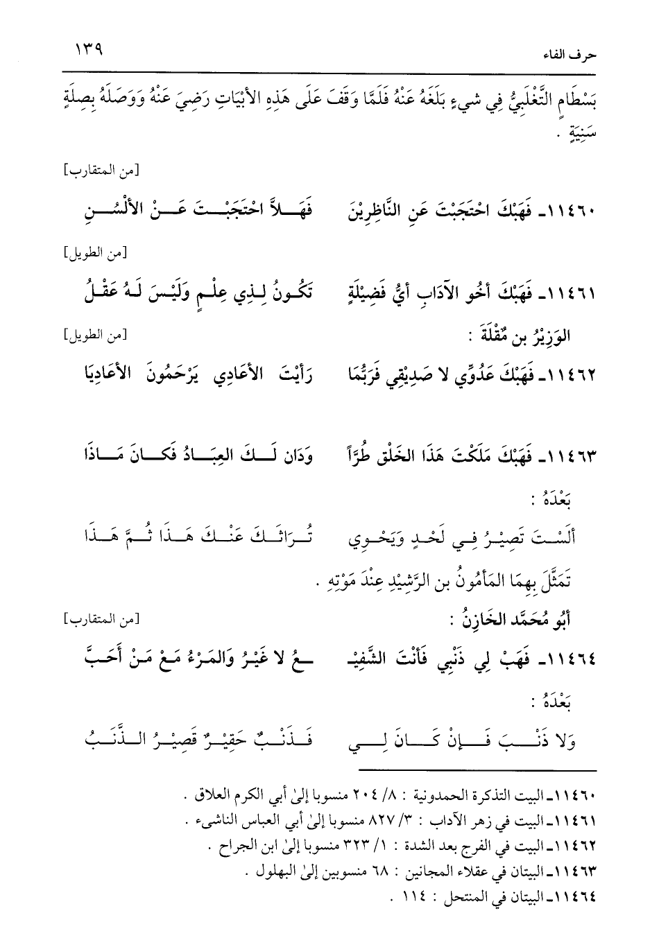 11460 - البيت التذكرة الحمدونية: 8/ 204 منسوبا إلى أبي الكرم العلاق.