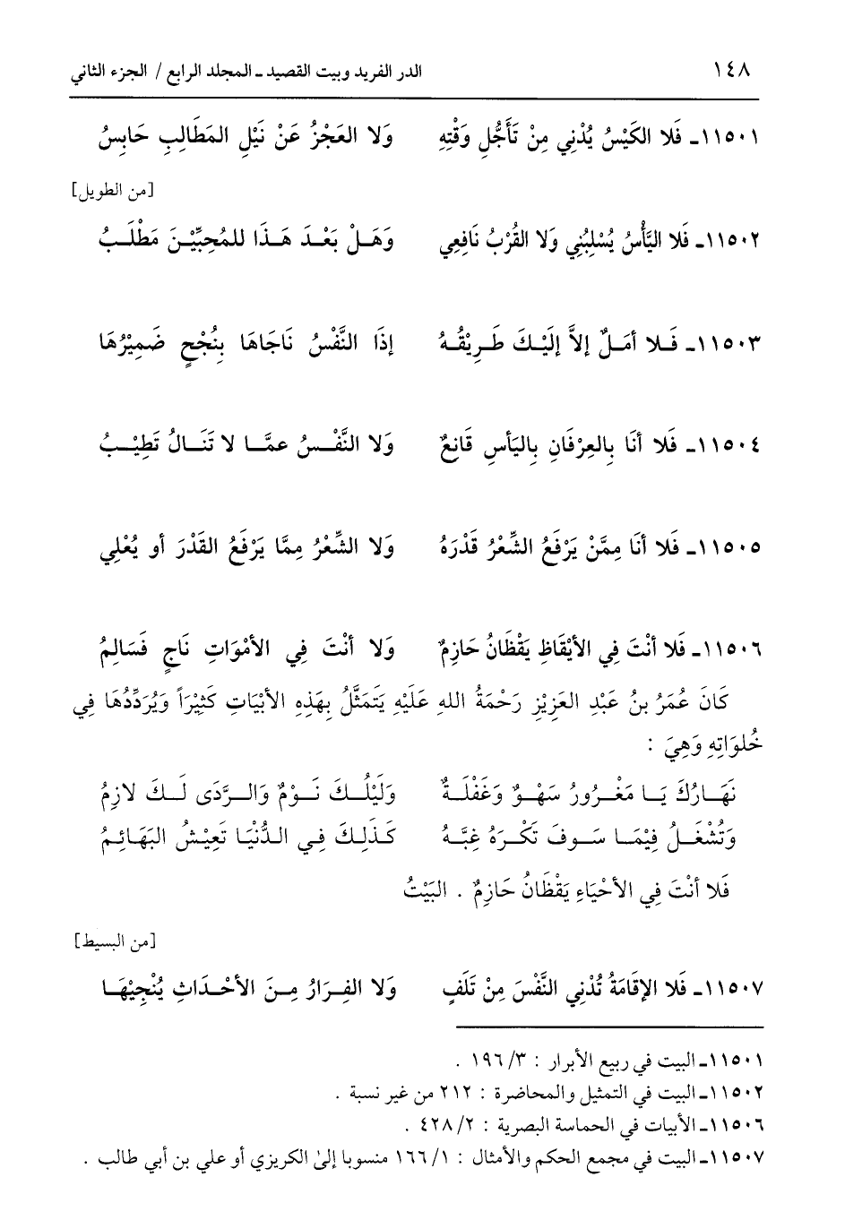 كَانَ عُمَرُ بنُ عَبْدِ العَزِيْزِ رَحْمَةُ اللَّهِ عَلَيْهِ يَتَمَثَّلُ بِهَذِهِ الأبْيَاتِ كَثِيْرًا وَيُرَدِّدُهَا فِي خُلوَاتِهِ وَهِىَ: